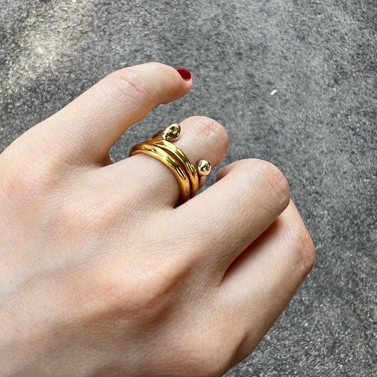 트리플 밴드(Triple Band) 18K 옐로 골드는 쌍가락지가 아닌 3개의 가락지를 함께 착용하는 디자인으로 작업된 반지입니다. 약 3mm의 두께의 반지는 왁스로 작업하여 단아한듯 하지만 비정형적인 굴곡을 살아있어 유니크함을 더합니다. 3개를 함께 착용하실 경우 이미지처럼 22K 골드 소재의 트리플 밴드와 함께 연출하셔도 클래식 하면서 세련된 느낌으로 스타일링 하실 수 있으며, 실버 소재의 반지와도 매치가 뛰어난 반지입니다.