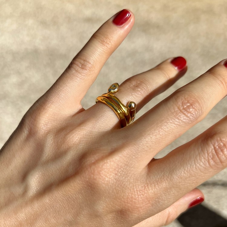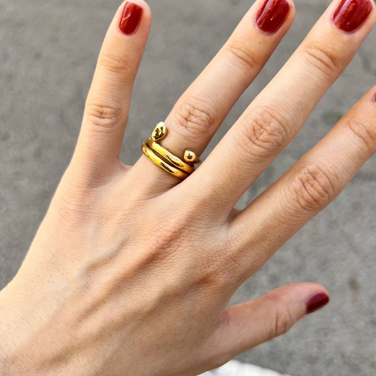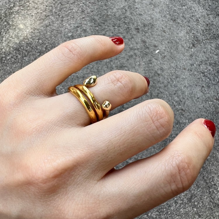 트리플 밴드(Triple Band) 22K 골드는 쌍가락지가 아닌 3개의 가락지를 함께 착용하는 디자인으로 작업된 반지입니다. 약 3mm의 두께의 반지는 왁스로 작업하여 단아한듯 하지만 비정형적인 굴곡을 살아있어 유니크함을 더합니다. 3개를 함께 착용하실 경우 이미지처럼 18K 골드 소재의 트리플 밴드와 함께 연출하셔도 클래식 하면서 세련된 느낌으로 스타일링 하실 수 있으며, 실버 소재의 반지와도 매치가 뛰어난 반지입니다.