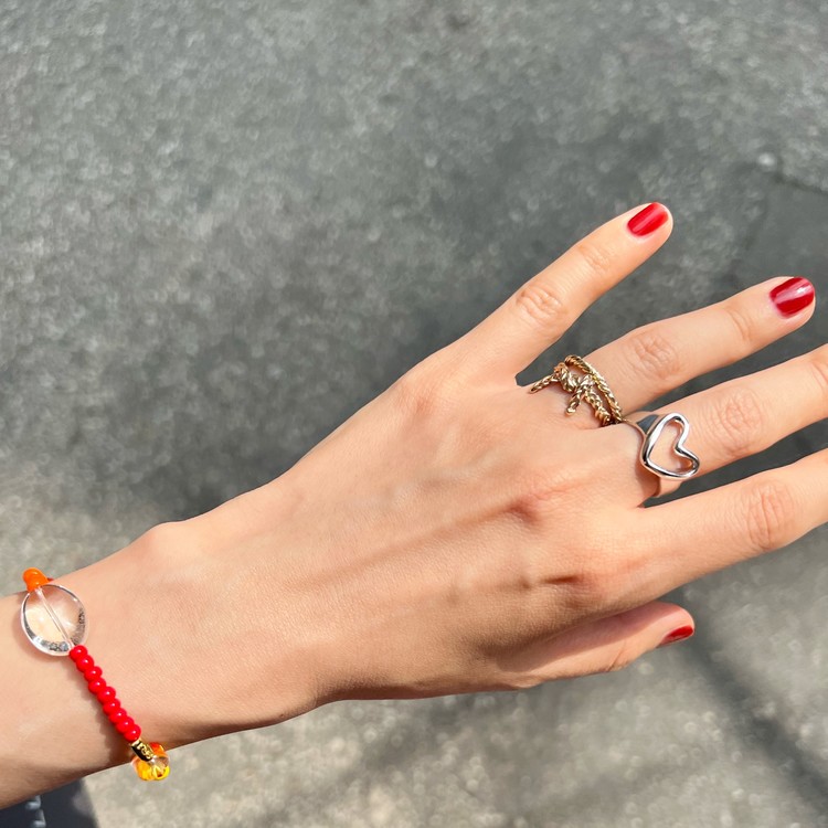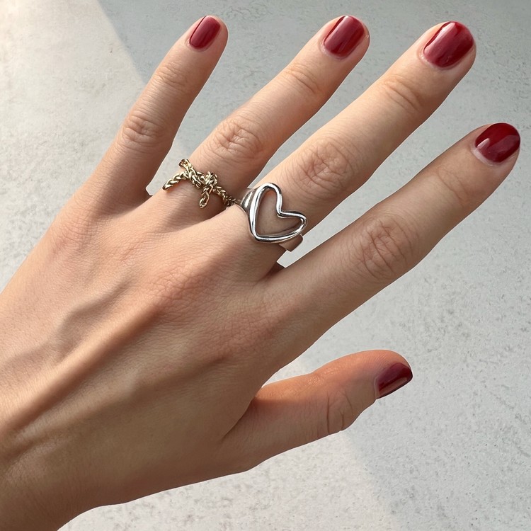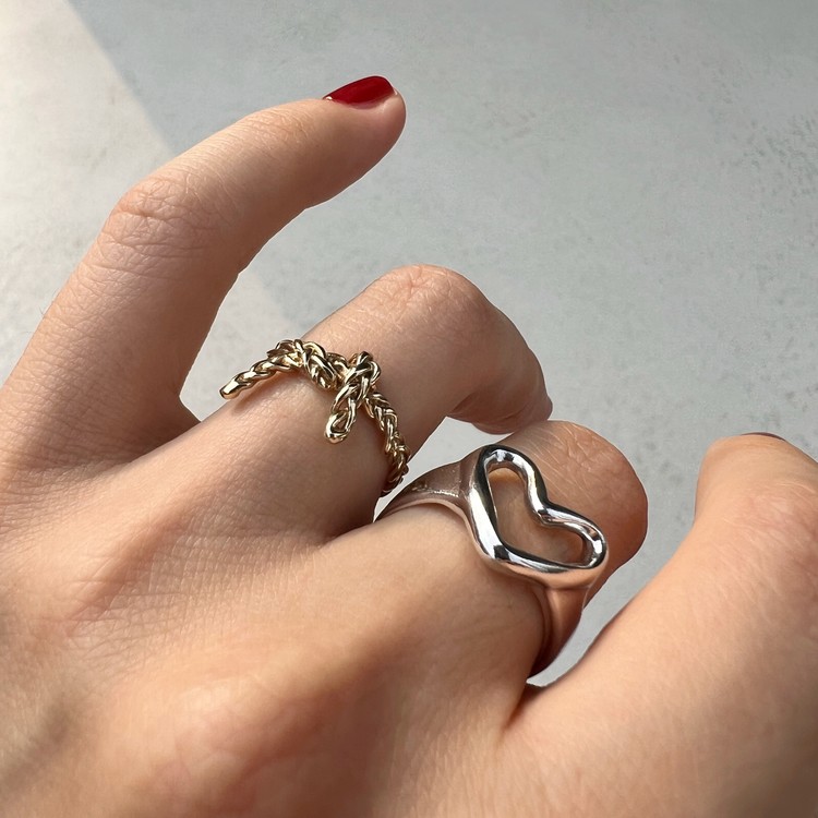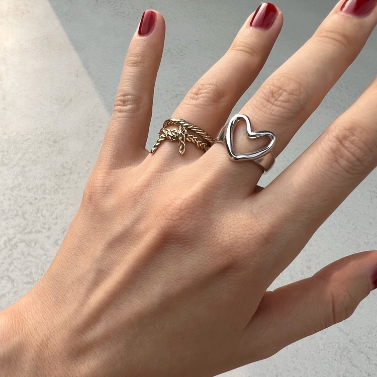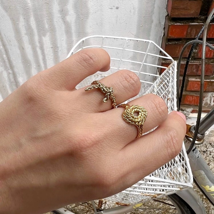 ๋ซ ๋ง(Knot Ring)์ ์ค์ ๊ฐ์ ์ฃผ์ผ๋ฆฌ ์์ค๋ฅผ ์ฌ์ฉํ์ฌ ๋งค๋ญ์ ์ง์ ๋์ ๋ง๋ ๋ฐ์ง์ ๋๋ค. ์์์ ์๋ง์ ์๋ฆ๋ค์์ด ๋ด๊ฒจ ์์ผ๋ฉฐ ๋จ์ํ๋ฏ ๋ ํนํ ๋ฉ์ ์ฐ์ถํ๋ ๋ฐ์ง์ ๋๋ค. ๋งค๋ญ์ ์ง์ ๋๊ณ ๋ฌถ์ด ์์ ํ์๊ธฐ ๋๋ฌธ์ ๋ง์น ๊ธ์์ผ๋ก ์ฎ์ ๋์ฒ๋ผ ์์ฐ์ค๋ฌ์ด ์ธ๋ จ๋ฏธ๊ฐ ์๋ ๋ฐ์ง์ด๊ธฐ๋ ํฉ๋๋ค. ์ฝ 2mm์ ์ ๋นํ ๋ฐด๋ ๋๊ป๊ฐ์ ๋ฐ์ผ๋ฆฌ์ฉ์ผ๋ก ์ฐฉ์ฉํ๊ธฐ ์ข์ผ๋ฉฐ, ๋ฐ์ง๋ฅผ ์ข์ํ์๋ ๋ถ๋ค์ด๋ผ๋ฉด ๋ค๋ฅธ ์์ฌ์ ๋์์ธ์ ๋ฐ์ง์ ํจ๊ป ์ฐฉ์ฉํ์ฌ๋ ์ด์ฐ๋ฌ์ง์ด ๋ฐ์ด๋ฉ๋๋ค.