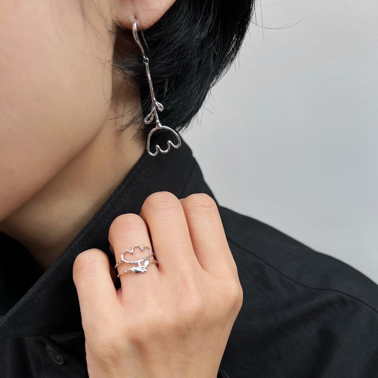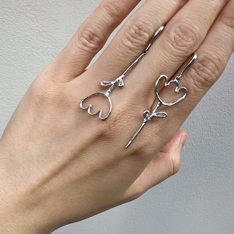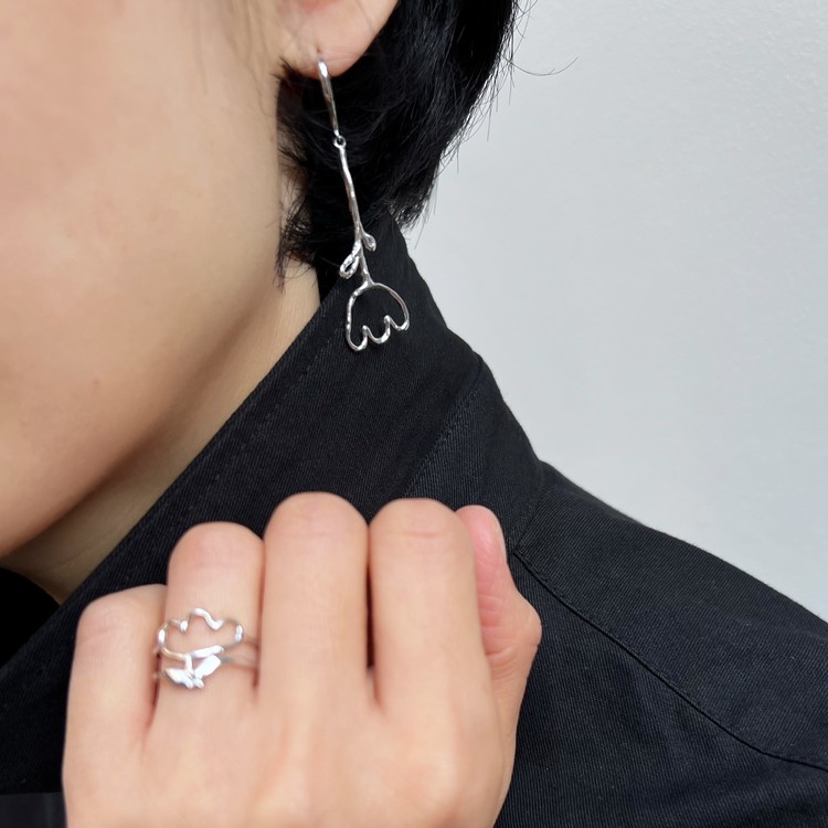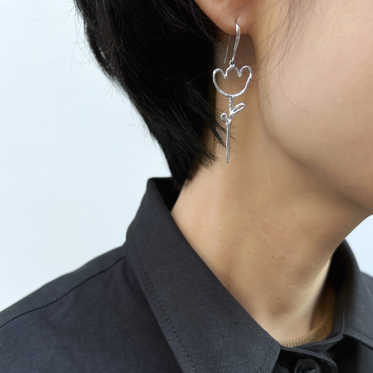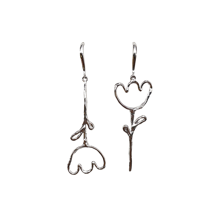 싱글 플라워 귀걸이(Single Flower Earrings)는 주얼리 디자이너이자 화가인 김호진 작가의 그림 속 꽃을 모티브로 하여 작업한 피스입니다. 좌, 우를 비대칭으로, 꽃의 방향을 다르게 연결하여 유니크한 멋을 더합니다. 그림을 그리듯 주얼리 왁스로 얇게 작업하였기 때문에 착용감이 가볍습니다. 후크 부분 또한 SGJ에서 자체 제작하여 완성도가 뛰어납니다.