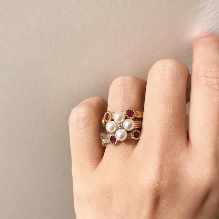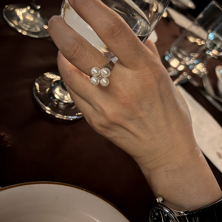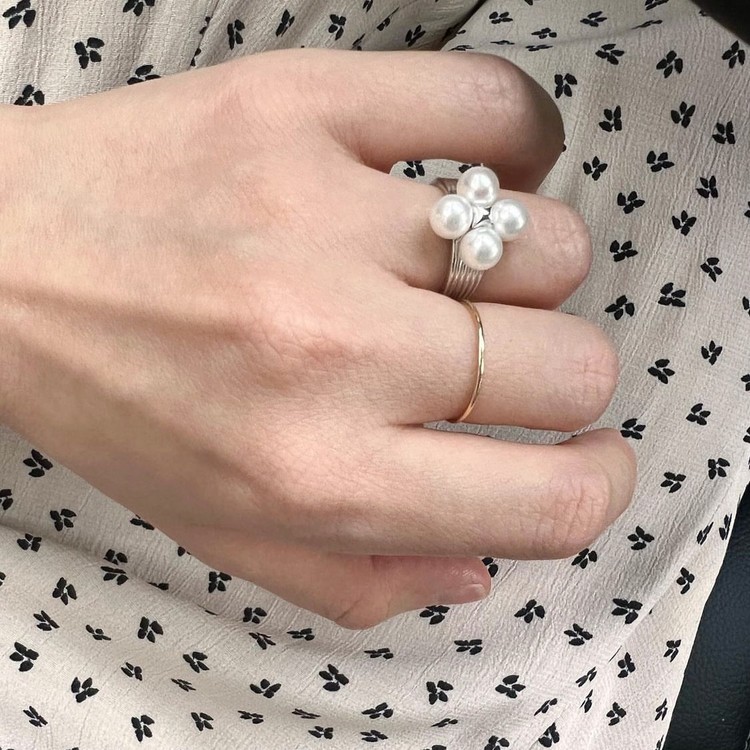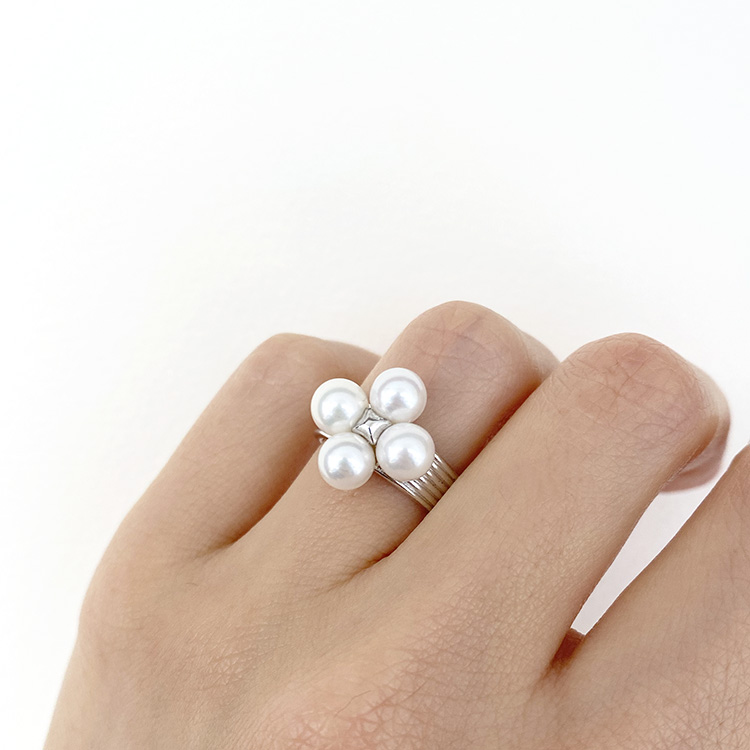 럭키펄링(Lucky Pearl Ring)은 6mm 진주 4개가 클로버가 연상되는 형태로 셋팅 된 반지입니다. 반지의 밴드 부분 직선 줄 패턴 또한 고급스러워 측면에서 보아도 우아한 아름다움이 돋보입니다. 부담스럽지 않은 진주 크기는 다양한 스타일의 의상과 함께 어우러짐이 뛰어납니다. 남양 진주처럼 큰 사이즈의 진주는 부담스럽지만, 진주의 단아한 멋이 필요하신 분들께 추천드립니다.