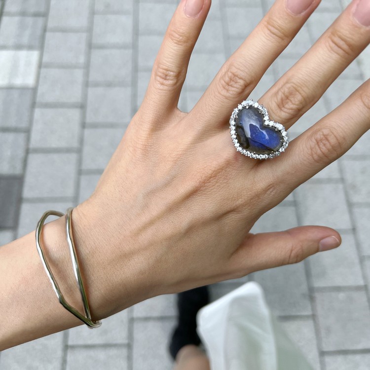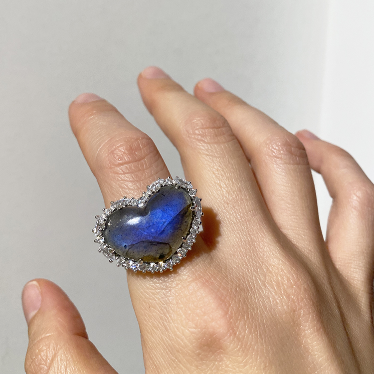 퀸하트링( Queen Heart Ring)은 레브라도라이트 원석을 하트 모양으로 깎아 셋팅한 반지로 압도적인 우아함과 사랑스러움을 담고 있습니다. 빛의 각도에 따라 마치 공작새의 깃털처럼 오묘한 색상을 나타내는 레브라도라이트는, '영혼의 성장', '치유'의 의미로 상징되는 스톤입니다.