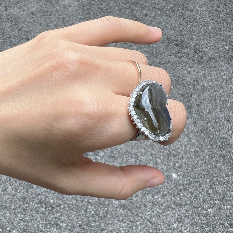 레브라도라이트의 주변부는 보트 형태와 원형의 큐빅 지르코니아를 셋팅하였습니다. 측면에서의 디자인은 할머니의 보석 상자에서 본 오래된 엔틱 반지의 분위기로 연출했으며, 반지 전체의 퀼리티를 높이기 위해 은 소재 위에 백금 도금으로 마무리 하였습니다. 계절에 상관없이 우아한 임팩트를 주기 위한 칵테일 반지로도 예쁘며, 반지 마니아 분들은 여러 반지와 함께 착용해도 세련되게 연출하실 수 있습니다.