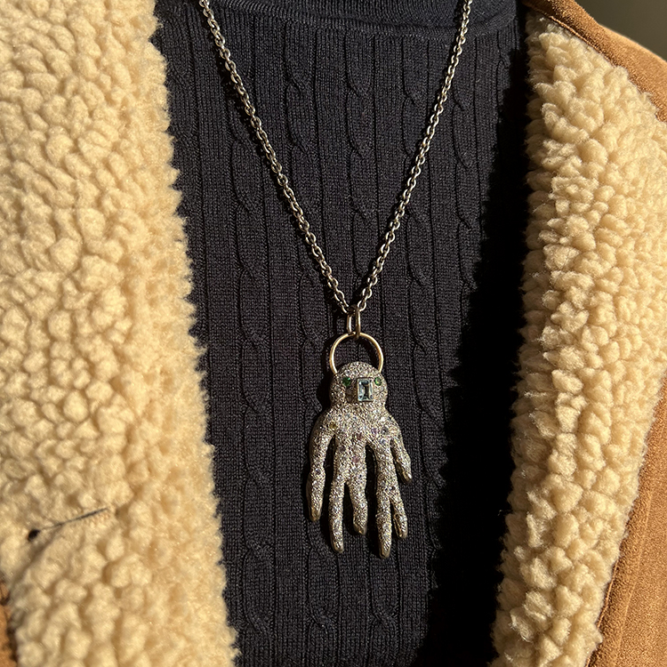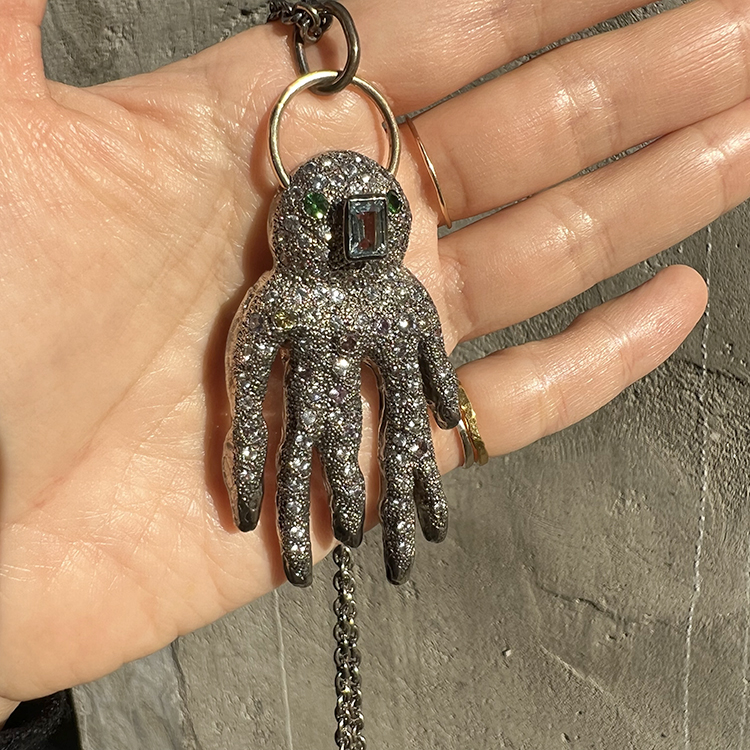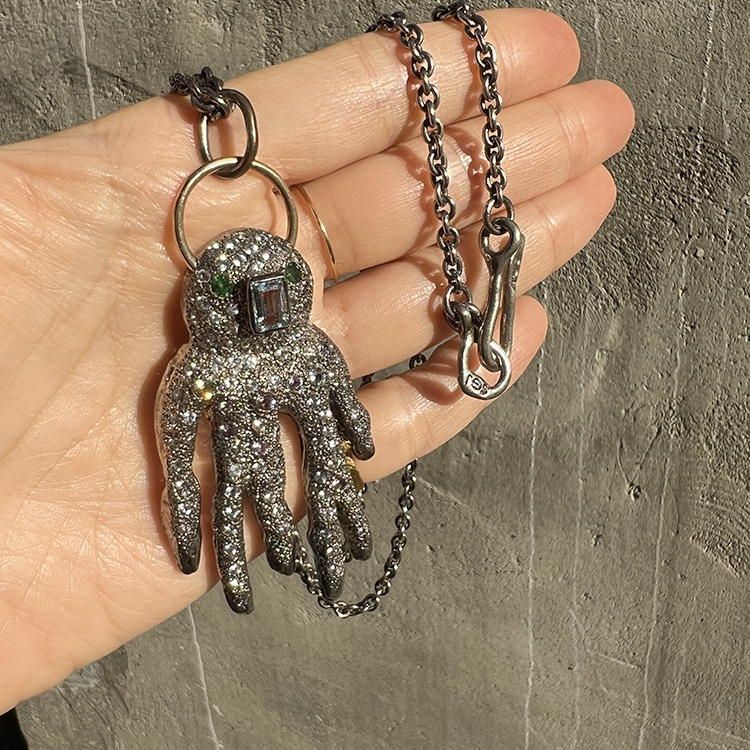 문어 펜던트 목걸이(Octopus Pendant Necklace)는 약 11년 전, 문어를 사랑하는 마음을 담아 작업한 피스입니다. 오랜 시간 동안 사랑을 받아 작품 주얼리 컨셉으로 간헐적으로 추가 에디션이 작업되고 있습니다. 이번 문어 펜던트 목걸이는 코는 아쿠아마린, 눈은 차보라이트, 몸은 사파이어가 셋팅되어 있습니다. 문어를 자주 그리기도 하여, 정형적인 형태가 아닌 회화적인 느낌으로 작업하였기 때문에 유니크한 멋이 가득합니다. 문어의 머리를 체인과 연결하는 고리 부분은 몸과 대비되는 색감을 표현하기 위해 14K 옐로 골드 소재를 사용하였으며, 고리를 뺀 모든 부분은 실버 소재에 엔틱처리를 하였습니다. 체인의 두께감과 문어의 사이즈감으로 민소매 의상을 입는 여름 보다는 봄, 가을, 겨울 긴소매 의상과 함께 연출했을때 더욱 멋스럽습니다. 체인의 총장은 55cm과 65cm 겸용으로 착용하실 수 있습니다. SGJ의 아트 주얼리를 좋아하시는 분들께 소장 가치가 있는 주얼리로 추천드립니다.