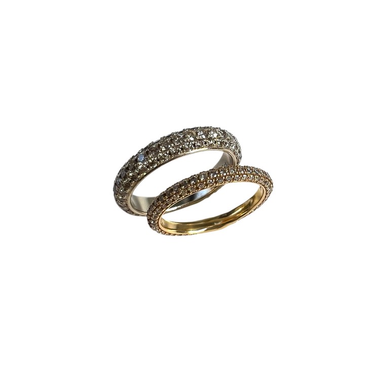 샴페인 다이아몬드를 3줄로 셋팅하여 둥근 단면을 표현 하였고 우아한 볼륨감으로 고급스러움을 더합니다. 밴드의 뒷부분 중 일부분은 다이아몬드 없이 금의 표면에 텍스쳐를 넣어 세련됨이 돋보입니다.