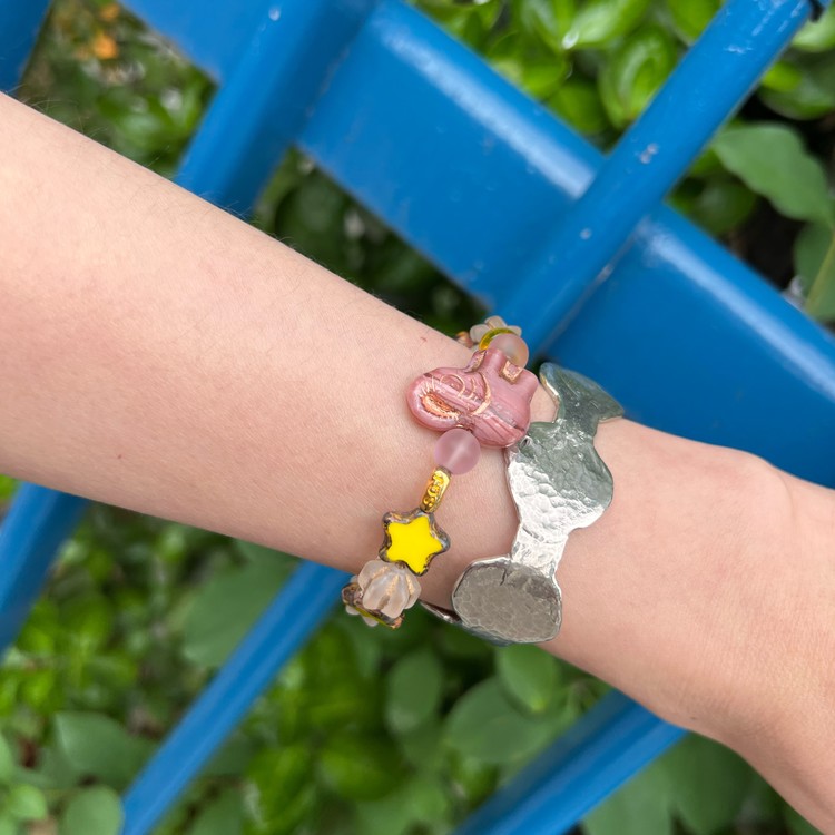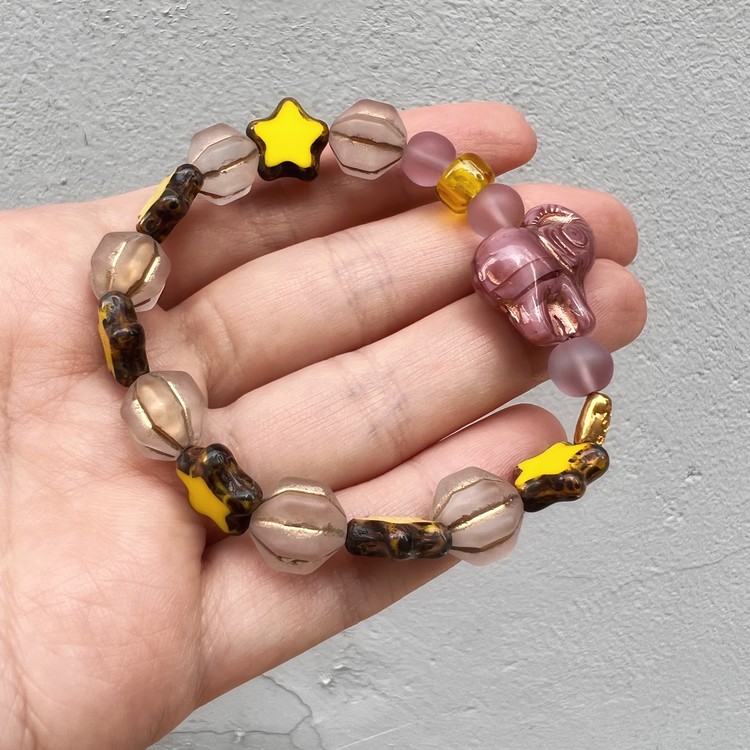 어린 왕자 비즈 팔찌(The Little Prince Beads Bracelet)는 체코산 글라스 비즈와 서독산 엔틱 비즈로 작업했습니다. 노란 컬러감이 경쾌한 별모양 비즈와 핑크톤 코끼리 비즈는 소설, 어린 왕자를 연상시켜 팔찌의 이름을 ‘어린 왕자 비즈 팔찌’로 지었습니다. 동심을 불러 일으키는 별과 코끼리의 조화가 경쾌고 사랑스럽습니다. 중간 중간 들어간 별사탕 모양의 비즈는 서독산 엔틱 비즈로 고급스러움을 더합니다. 캐주얼하고 발랄하게 연출할 수 있는 팔찌이며, 이미지처럼 실버 소재, 금 소재 팔찌와 함께 매치해도 세련되게 착용 하실 수 있습니다.