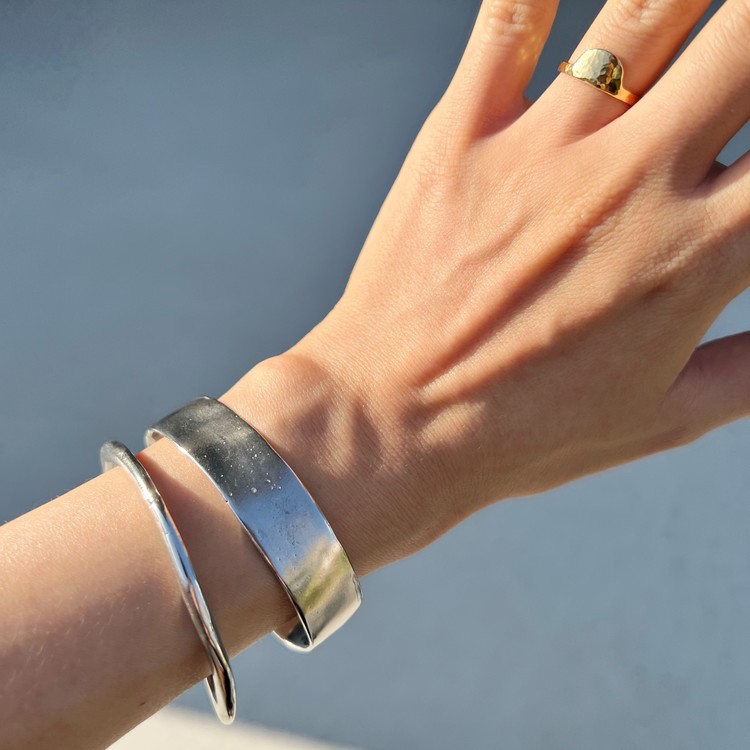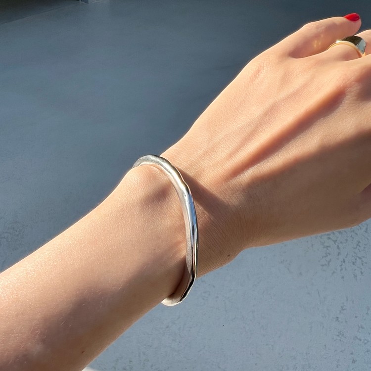 호프뱅글(Hope Bangle)은 약 3mm의 얇은듯 보이는 두께이지만 단면의 너비가 5mm로 중량감 있는 디자인의 뱅글입니다. 각도에 따라 달리 보이는 선의 멋이 세련된 피스입니다. 뱅글 내경은 약 15.5cm으로 사이즈 M을 기본형으로 작업됩니다. M 사이즈는 손목 둘레 13.5~14.5cm인 경우 편하게 착용하실 수 있으며, 그 외의 사이즈는 맞춤 제작으로 작업됩니다.