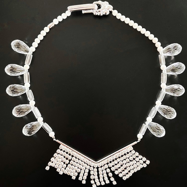 화려한 디자인이면서도 색톤을 화이트로 통일하여, 정제된 세련됨을 동시에 담고 있습니다. 목걸이를 탈, 부착시 여밈 기능을 하는 장식 고리 부분 또한 SGJ의 노하우로 자체 제작하여 완성도를 높였습니다. 경량의 비즈 스톤을 사용하여 착용감이 무겁지 않으며, 드레시한 룩에도 어울리지만 캐주얼한 티셔츠, 스웻셔츠와 매치해도 멋스럽게 연출하실 수 있습니다.