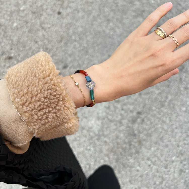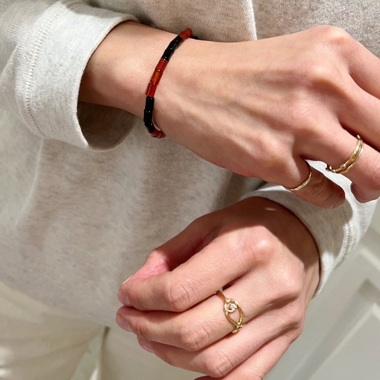 오닉스 아게이트 비즈 팔찌(Onyx & Agate Beads Breacelet)는 튜브 형태로 깎은 오닉스와 아게이트를 메인으로 하고, 나뭇잎 모양의 체코산 유리 비즈, 사각 형태의 엔틱 비즈들을 포인트로 엮은 팔찌입니다. 자마노라 불리기도 하는 붉은빛 아게이트와 블랙의 오닉스 조합은 미니멀한 멋을 담고 있으며, 엔틱 비즈들의 포인트는 다소 심플해 보일 수 있는 팔찌에 세련된 아름다움을 더합니다. 전체적인 색감이 가을, 겨울에 어울리는 에스닉한 톤이며, 두께감이 얇은 팔찌로 긴소매 옷에 착용해도 편안합니다.