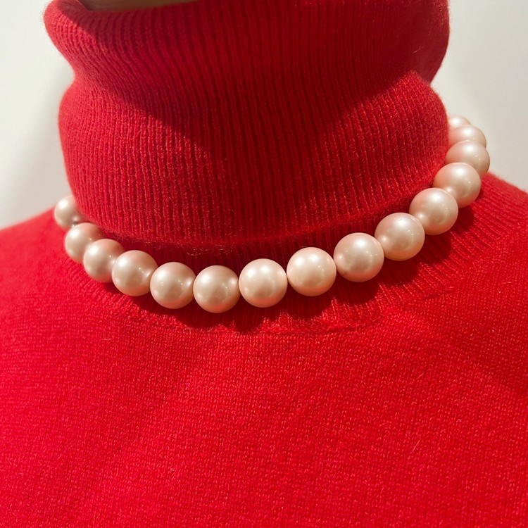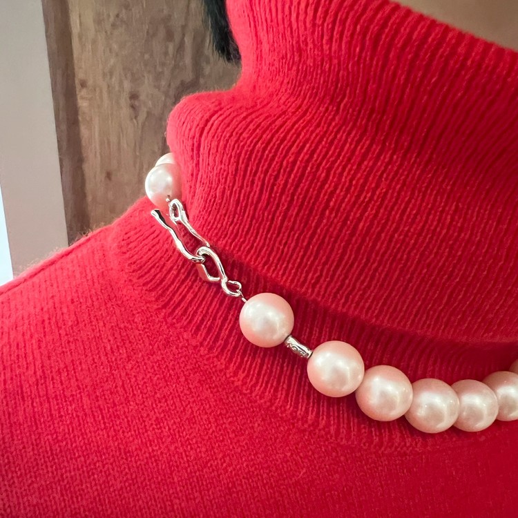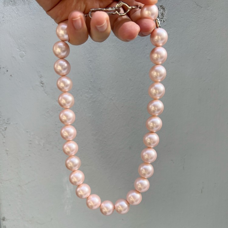 핑크 펄 목걸이(Pink Pearl Necklace)는 약 14mm 핵진주를 엮어 만들었습니다. 핵진주는 조개 껍질 성분으로 만들어진 합성 진주로 천연 진주와 흡사하지만, 내구성과 가성비가 뛰어난 소재입니다. 14mm 크기의 진주는 터틀넥 스웨터등과 매치 하셔도 볼드한듯 우아한 느낌을 줍니다. SGJ 만의 자체 제작 참과 마감 장식으로 완성도를 높였으며 은은한 핑크톤은 사랑스러움 또한 담고 있습니다. 목걸이 길이는 약 41cm의 S, 또는 43cm의 M 중 선택하실 수 있습니다. 목이 가는 분, 목선에 딱 붙는 듯한 느낌을 선호하시는 분은 S을 추천드리며, 터틀넥 스웨터와 함께 스타일링 하실 분, 살짝 여유있는 느낌으로 착용 원하시는 분들은 M을 추천드립니다.