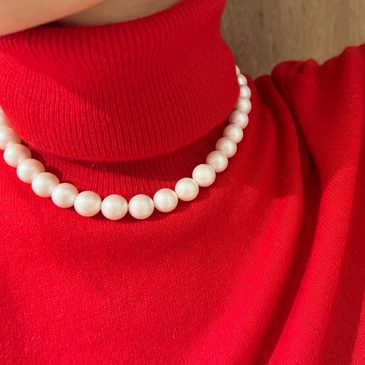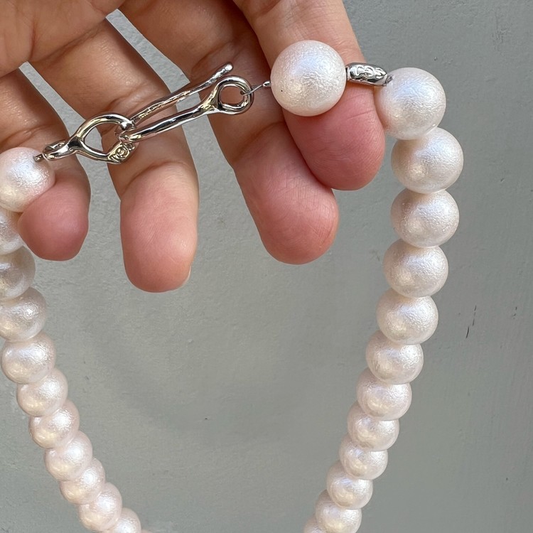 아이시 펄 목걸이(Icy Pearl Necklace)는 약 12mm 핵진주를 엮어 만들었습니다. 핵진주는 조개 껍질 성분으로 만들어진 합성 진주로 천연 진주와 흡사하지만, 내구성과 가성비가 뛰어난 소재입니다. 아이시 펄은 화이트톤 진주 표면에 은은한 텍스쳐가 있어 유니크함을 더합니다. 12mm 크기의 진주는 터틀넥 스웨터등과 매치 하셔도 우아한 느낌을 줍니다. SGJ 만의 자체 제작 참과 마감 장식으로 완성도를 높였습니다. 목걸이 길이는 약 41cm의 S, 또는 43cm의 M 중 선택하실 수 있습니다. 목이 가는 분, 목선에 딱 붙는 듯한 느낌을 선호하시는 분은 S을 추천드리며, 터틀넥 스웨터와 함께 스타일링 하실 분, 살짝 여유있는 느낌으로 착용 원하시는 분들은 M을 추천드립니다.