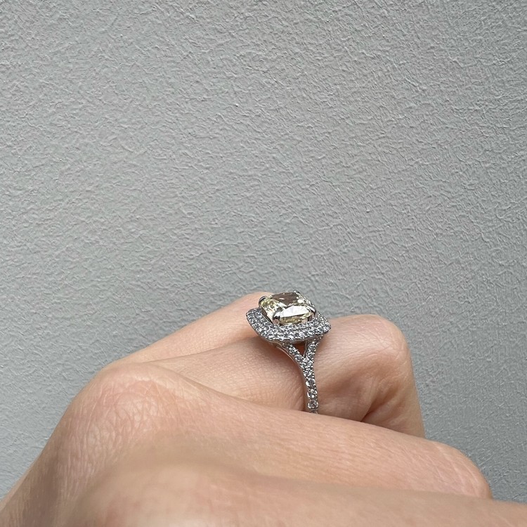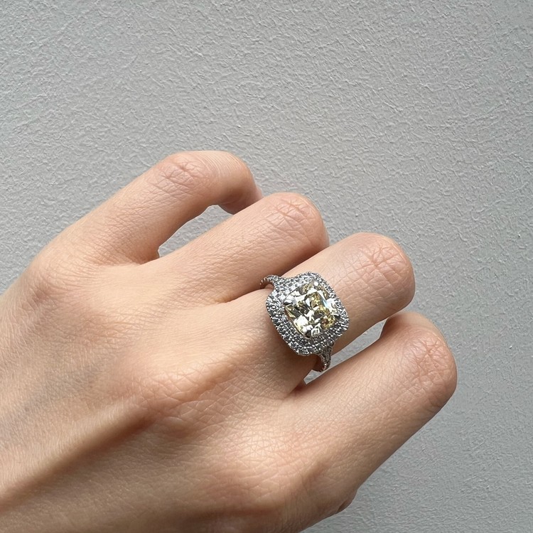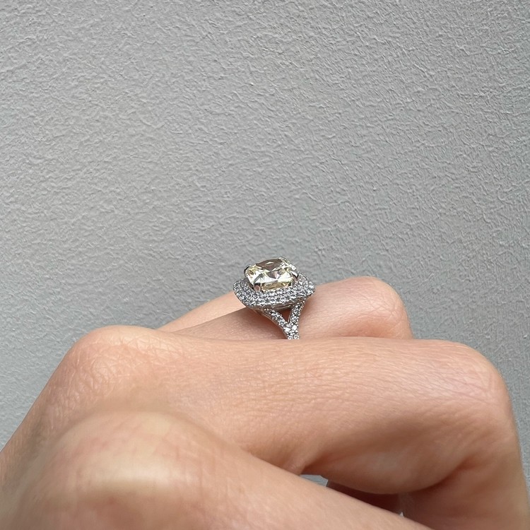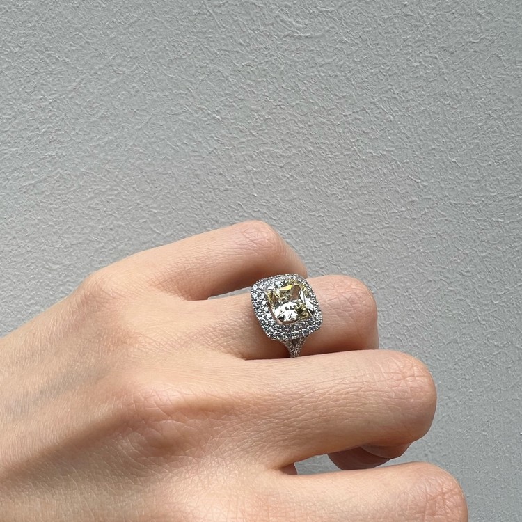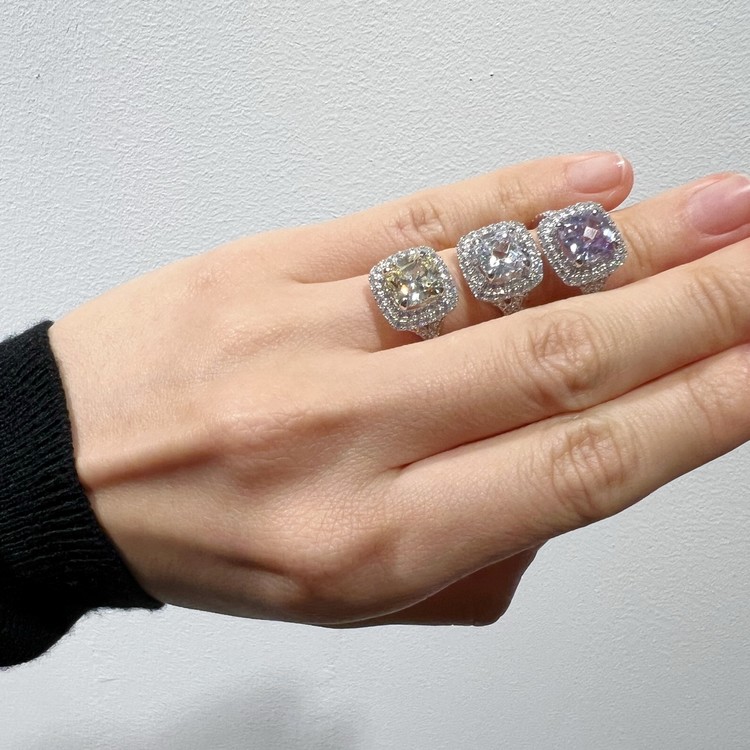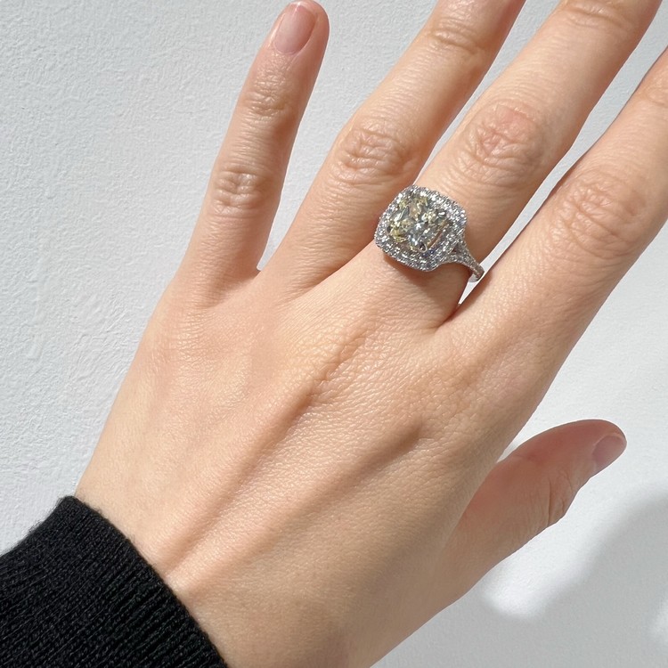 은 소재는 백금 도금으로 마무리하여 변색을 더디게 했습니다. 중심 스톤 주변을 돌아가며 셋팅한 반지 스타일을 헤일로 셋팅(Halo Setting)이라 하는데 캐롤링의 경우, 클래식한 디자인이지만 중심 스톤은 쿠션컷으로 선택하여 유니크함 또한 담고 있습니다.