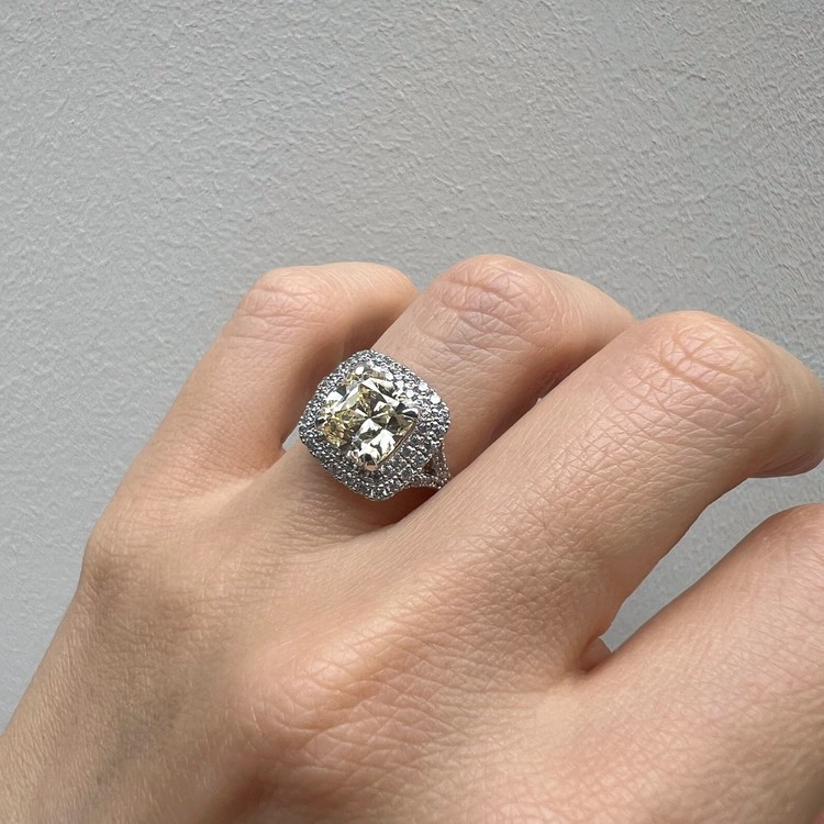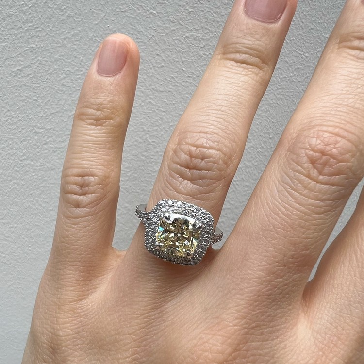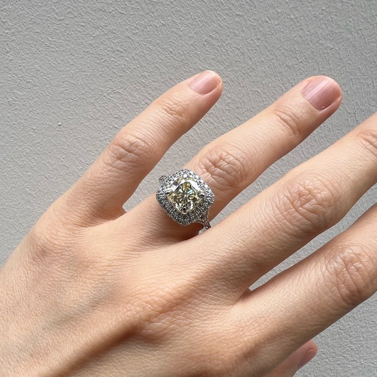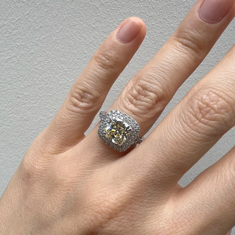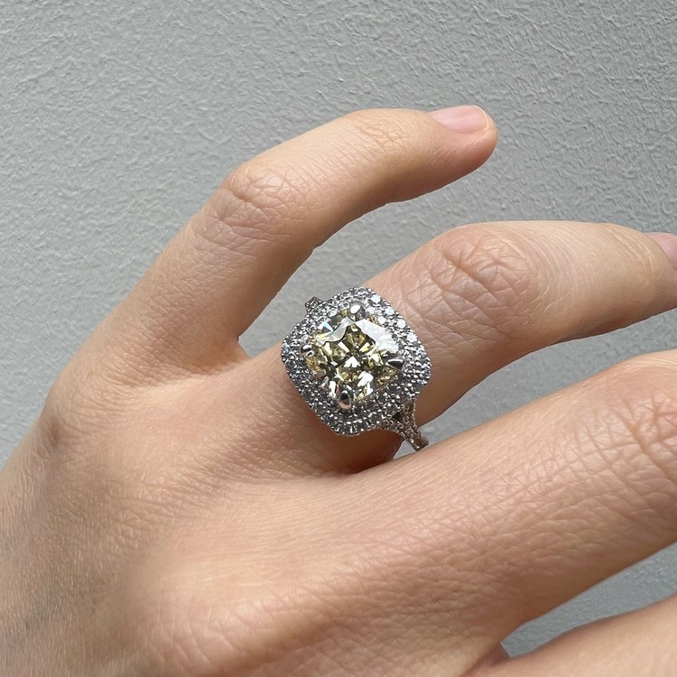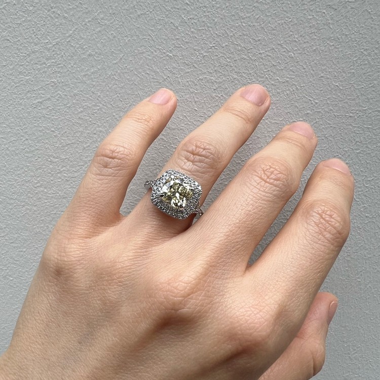은 소재는 백금 도금으로 마무리하여 변색을 더디게 했습니다. 중심 스톤 주변을 돌아가며 셋팅한 반지 스타일을 헤일로 셋팅(Halo Setting)이라 하는데 캐롤링의 경우, 클래식한 디자인이지만 중심 스톤은 쿠션컷으로 선택하여 유니크함 또한 담고 있습니다.
