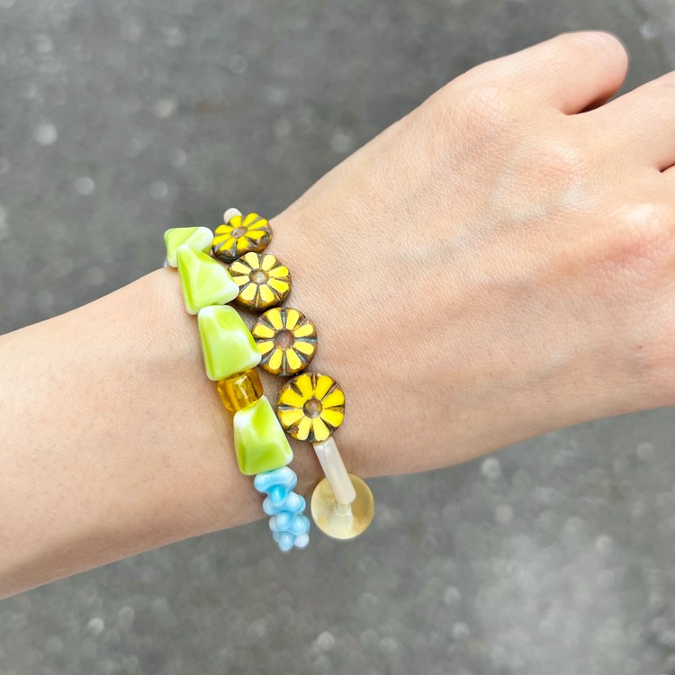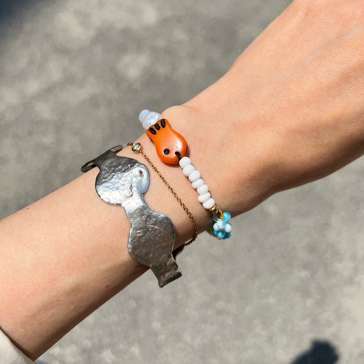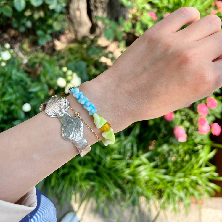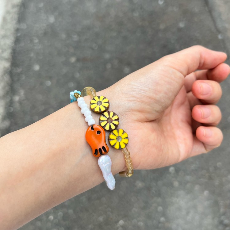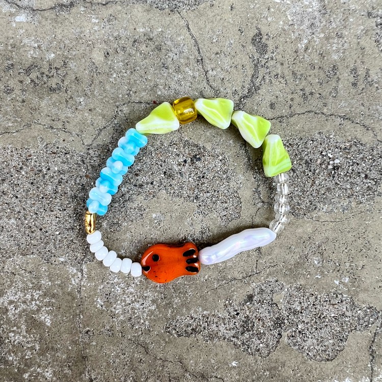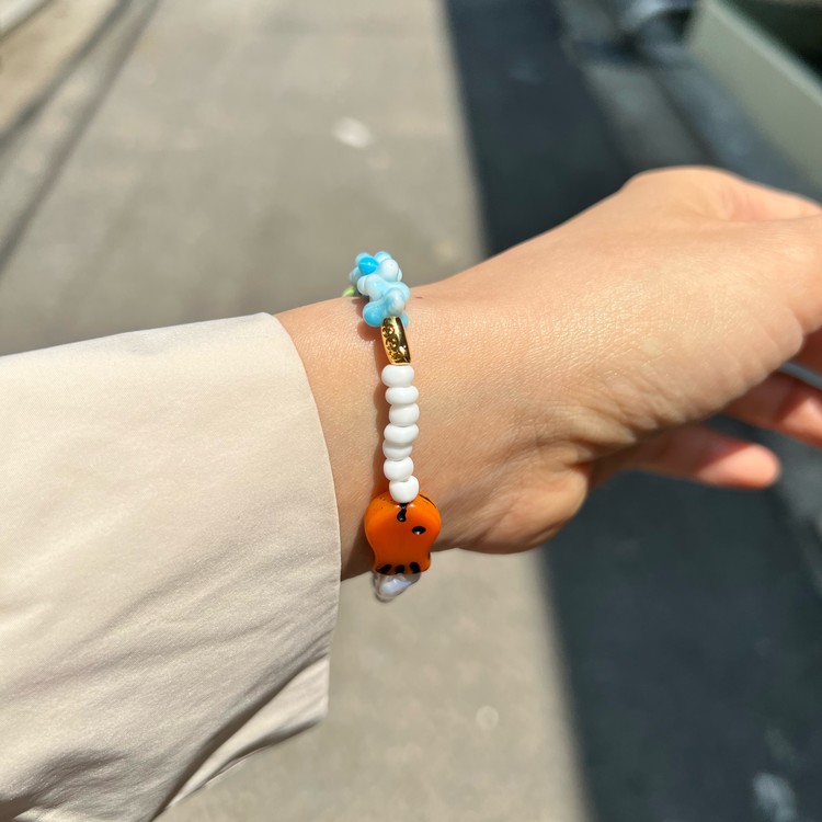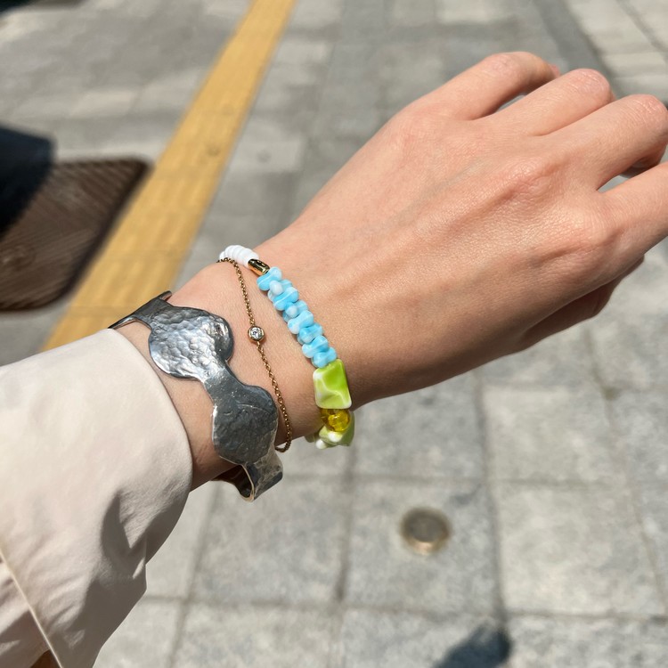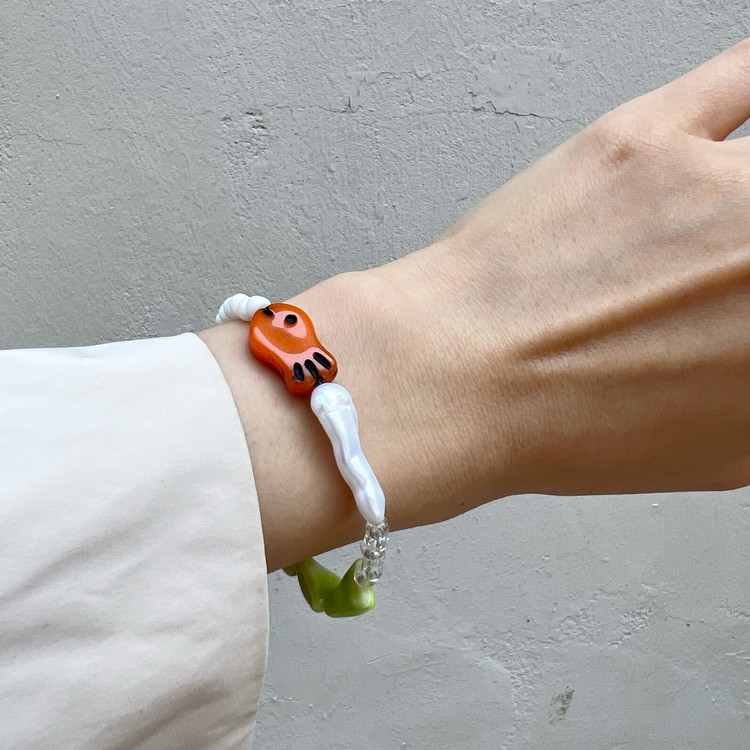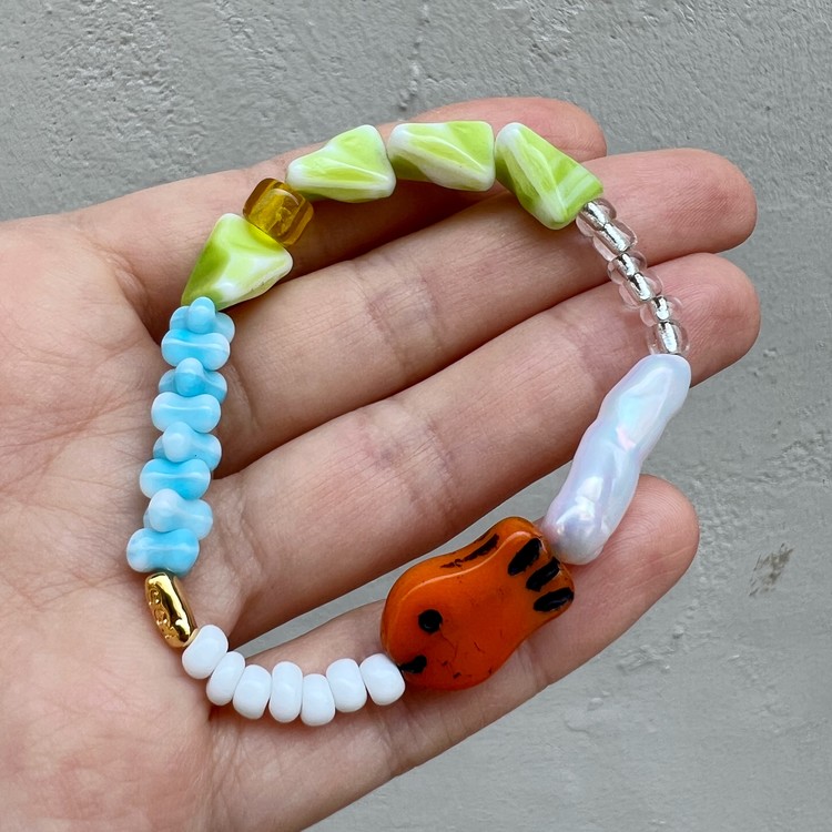 ๋ฌผ๊ณ ๊ธฐ ๋น์ฆ ํ์ฐ(Fish Bead Bracelet)๋ ์ฒด์ฝ์ฐ ๋ฌผ๊ณ ๊ธฐ ๋น์ฆ๋ฅผ ํฌ์ธํธ๋ก ํ์ฌ ์ ๊ธฐ์ ํํ์ ๋ธ๋ฃจํค, ๊ทธ๋ฆฐํค ์ ๋ฆฌ ๋น์ฆ, ๋ฐ๋กํฌ ์์ ์ง์ฃผ ๋ฑ๊ณผ ํจ๊ป ์์ ํ์ต๋๋ค. ๋ ํนํ ํํ, ์ฐ๋ปํ ์ปฌ๋ฌ์ ์ฒด์ฝ์ฐ ๋น์ฆ๊ฐ ๊ณ ๊ธ์ค๋ฌ์์ ๋ํฉ๋๋ค. ์ ๋ํฌํ ๋ฉ์ด ์์ง๋ง ์ ์ฒด์ ์ธ ๋ถํผ๊ฐ์ด ํฌ์ง ์๊ธฐ ๋๋ฌธ์ ๋ถ๋ด์์ด ์คํ์ผ๋ง ํ์ค ์ ์์ต๋๋ค.
