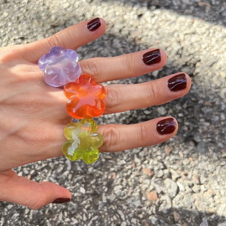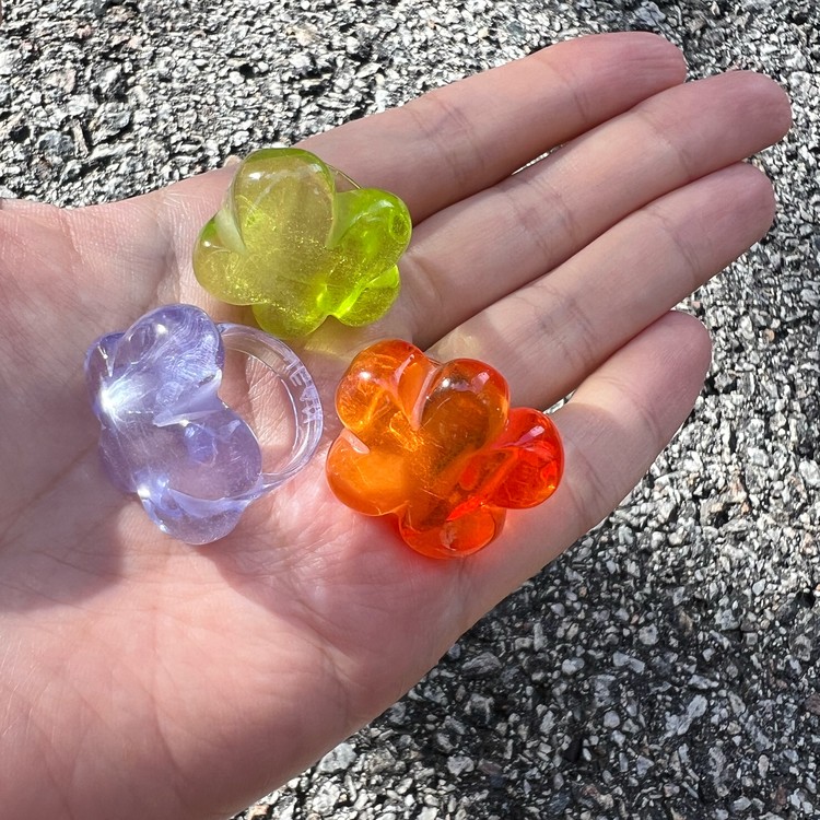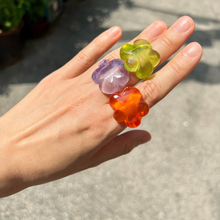 젤리 플라워링은 투명 플라스틱 소재를 사용하여 더운 계절에 스타일링하기 최적화 되어 있으며, SGJ 금, 은 소재 주얼리와 함께 착용하면 더욱 멋스럽게 연출하실 수 있습니다. 편안한 착용감을 위해 반지 밴드 부분을 얇게 작업 하였으며, 작업 공정의 특성상 반지 사이즈는 약 13-약 15호에 근접합니다. 사이즈가 조금 크신 경우, 얇은 두께의 금, 다이아몬드 소재 밴드등과 레이어드로 착용하시면 예쁘게 연출 및 착용이 가능하오니 참고하시기 바랍니다.