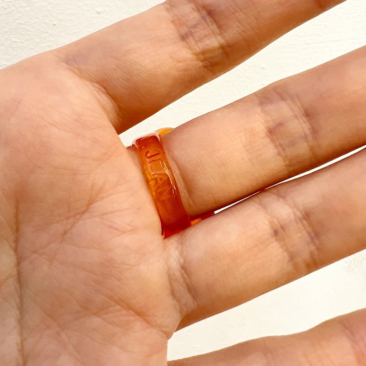 젤리 플라워링(Jelly Flower Ring) 오렌지 색상은 꽃 모양으로 직접 깎아 만든 원본 형태에, 플라스틱 반지 제작을 위한 틀을 만들어 작업했습니다. SGJ의 주얼리 디자이너이자 화가인 김호진 작가가 즐겨 그리는 꽃 형태가 매력적인 반지입니다. 사랑스런 꽃의 형태이지만, 전체적인 실루엣, 양감으로 세련된 이미지를 연출하며, 오렌지 색상의 투명 플라스틱은 밝고 쾌활한 느낌입니다.
