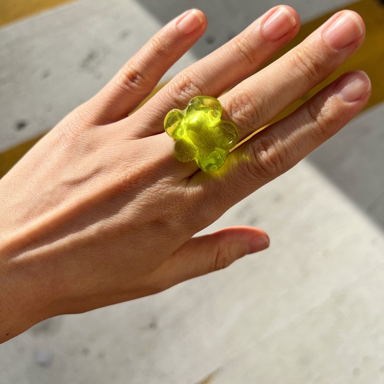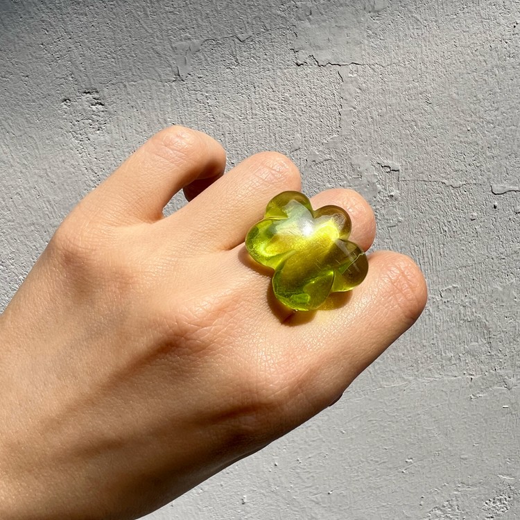 젤리 플라워링(Jelly Flower Ring) 그린 색상은 꽃 모양으로 직접 깎아 만든 원본 형태에, 플라스틱 반지 제작을 위한 틀을 만들어 작업했습니다. SGJ의 주얼리 디자이너이자 화가인 김호진 작가가 즐겨 그리는 꽃 형태가 매력적인 반지입니다. 사랑스런 꽃의 형태이지만, 전체적인 실루엣, 양감으로 세련된 이미지를 연출하며, 그린 색상의 투명 플라스틱은 청량한 느낌입니다.