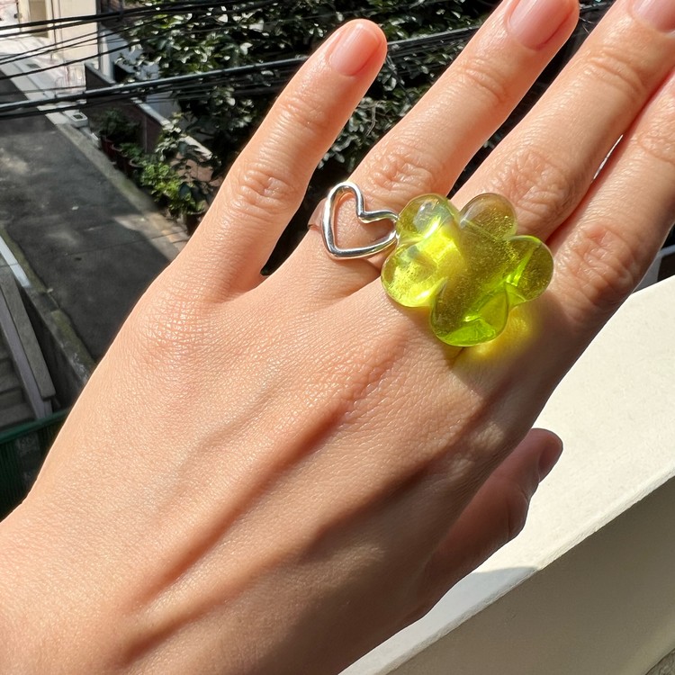 젤리 플라워링은 투명 플라스틱 소재를 사용하여 더운 계절에 스타일링하기 최적화 되어 있으며, SGJ 금, 은 소재 주얼리와 함께 착용하면 더욱 멋스럽게 연출하실 수 있습니다. 편안한 착용감을 위해 반지 밴드 부분을 얇게 작업 하였으며, 작업 공정의 특성상 반지 사이즈는 약 13-약 15호에 근접합니다. 사이즈가 조금 크신 경우, 얇은 두께의 금, 다이아몬드 소재 밴드등과 레이어드로 착용하시면 예쁘게 연출 및 착용이 가능하오니 참고하시기 바랍니다.