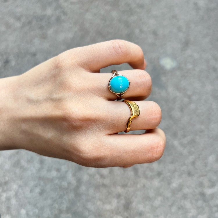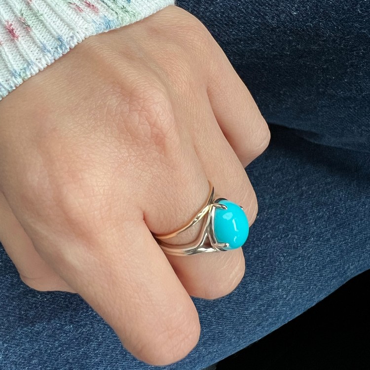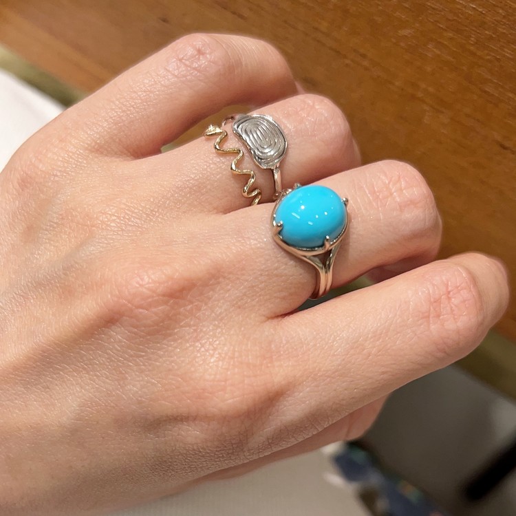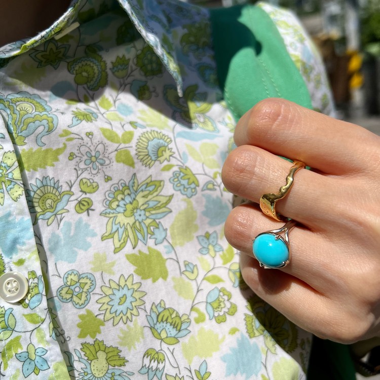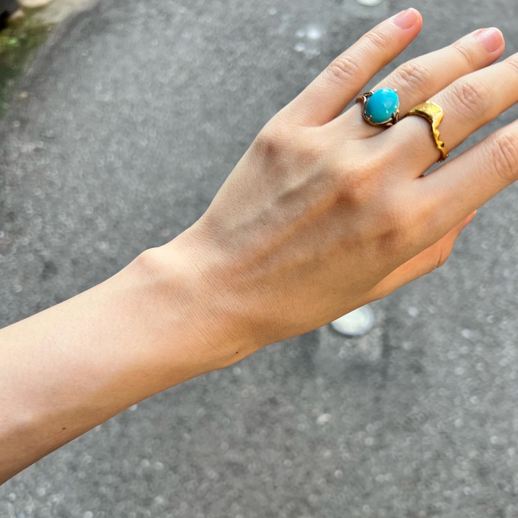 엔틱 스타일 터키석 반지는 할머니의 보석 상자에서 보았던 어린시절 '알반지'를 떠올리게 하는 디자인입니다. 측면 반지 밴드는 두 줄인듯 작업하여 단순하지만 우아한 느낌을 살렸습니다. 14K 화이트 골드는 별도의 도금 없이 있는 그대로의 화이트 골드 색감을 살려, 은은한 샴페인 톤이 감돕니다. 엔틱 분위기와 심플한 멋을 즐기며 부담감 없는 주얼리 스타일링을 선호하시는 분들께 추천드립니다.