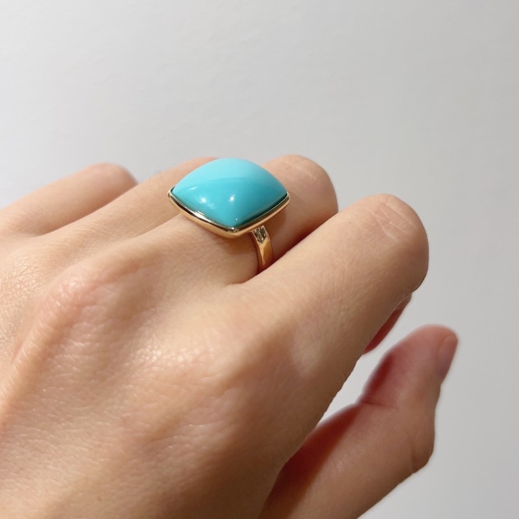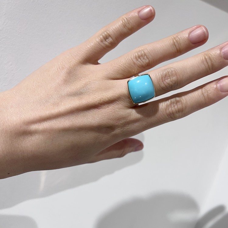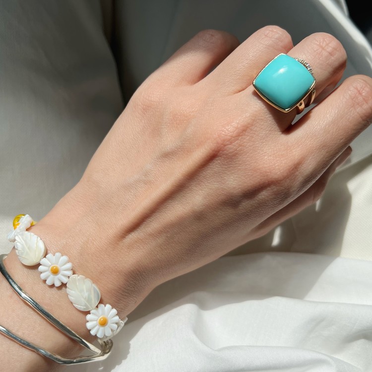 슬리핑 뷰티 터키석반지(Sleeping Beauty Turquoise Ring)는 파스텔톤 블루가 임펙트 있는 피스입니다. 터키석 중에서도 파스텔톤 블루를 띄는 터키석은 '슬리핑 뷰티'라 불립니다. 약 15mm x 17mm 크기의 사각컷은 볼드한 사이즈로 우아한 존재감을 발산합니다. 스톤의 돋보임을 메인으로 하기 위해 셋팅은 도드라지지 않게 최대한 심플한 테두리만 설정하여 작업하였고, 안정감 있는 착용을 위해 반지 밴드 두께는 약 3mm로 만들었습니다. 터키석은 성공과 승리를 약속하는 의미를 담고 있는 보석이며, 12월 탄생석 이기도 합니다. 담백한 디자인이지만 임팩트 있고, 질리지 않게 착용할 수 있는 주얼리 스타일링을 선호하시는 분들께 추천드립니다.