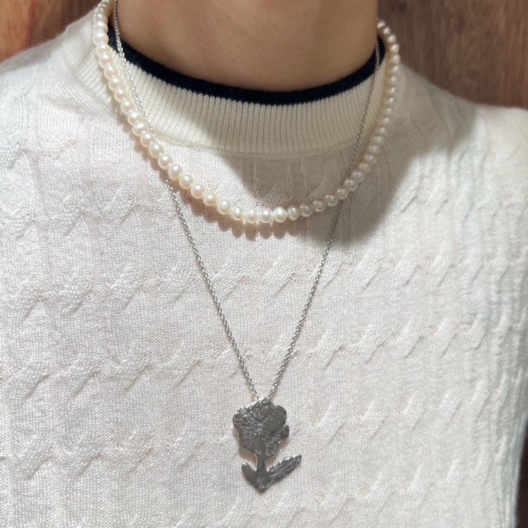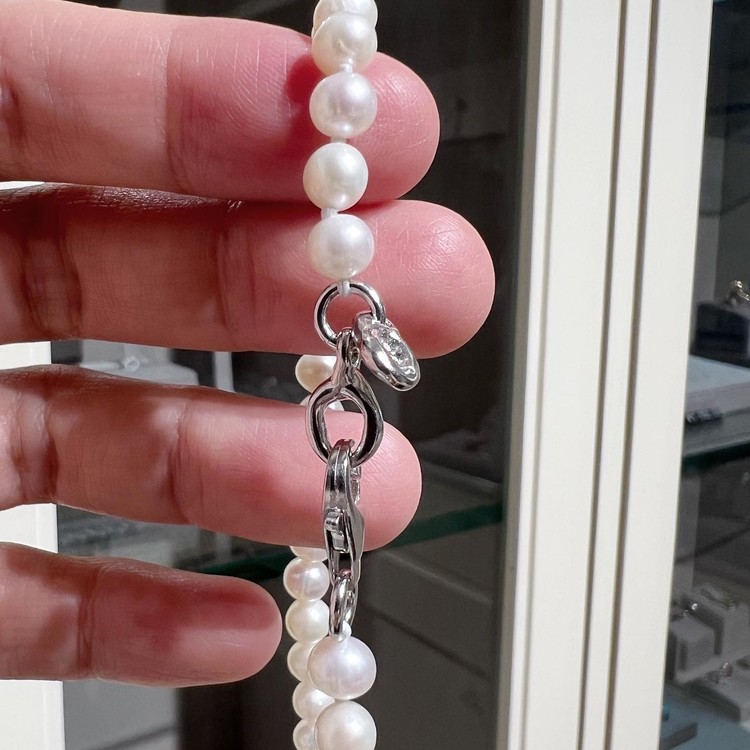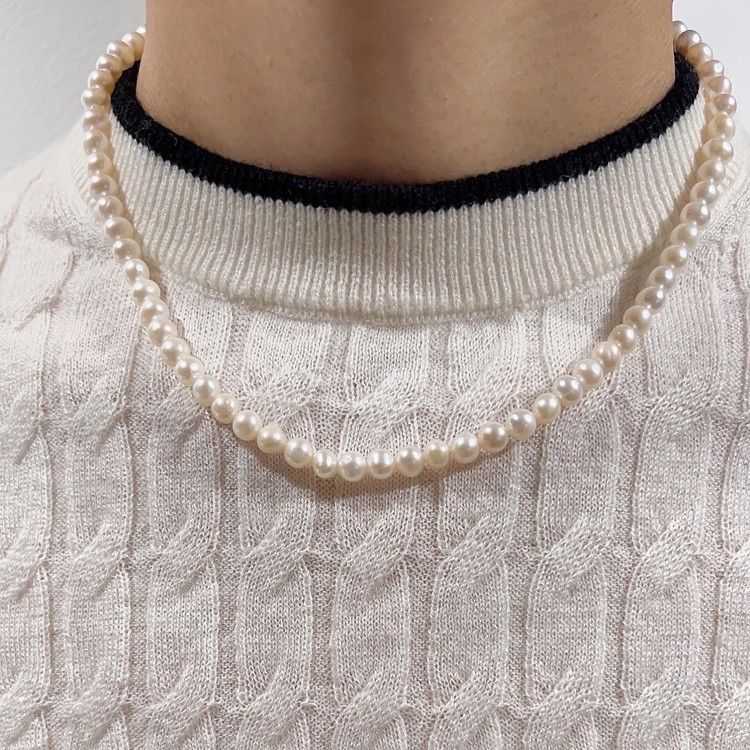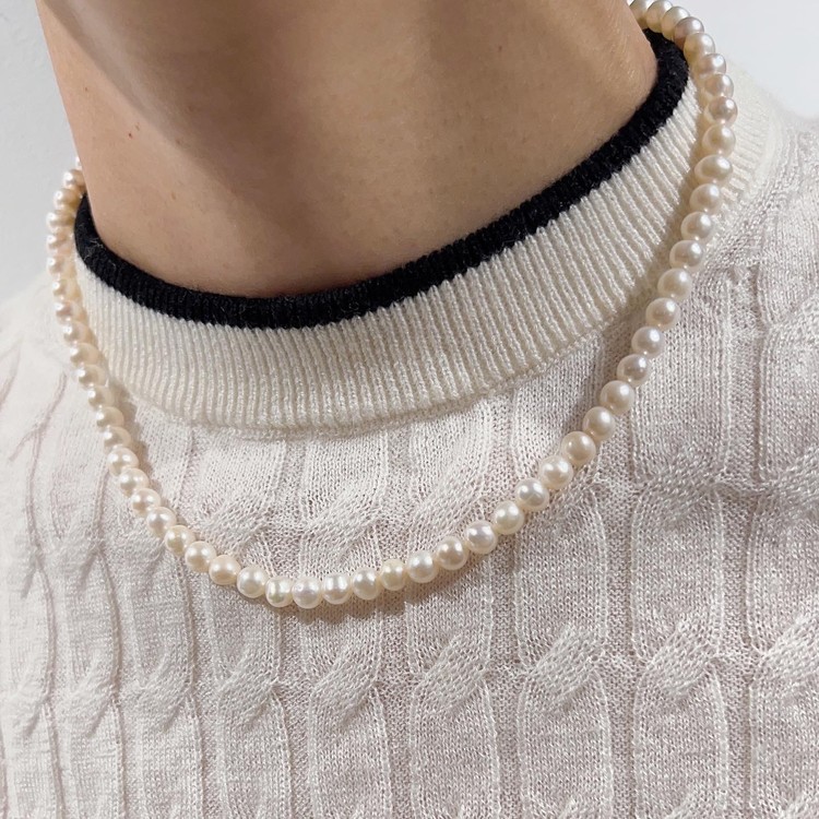 5mm 진주 목걸이는 양식 진주를 사용, 총 기장 약 42cm로 만들어 졌습니다. 목걸이 여밈 부분인 마감 장식에는 수작업으로 만든 SGJ 참을 달아 특별함을 더했으며, 은 소재 부분은 모두 백금 도금으로 마무리하여, 변색을 더디게 하였습니다. 5mm 진주 사이즈는 잔잔한 느낌의 진주 목걸이로, 클래식한 아름다움과 더불어 캐주얼하고 청초한 분위기를 연출 할 수 있어 활용도가 높은 피스입니다.