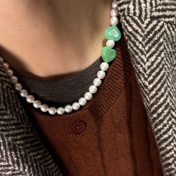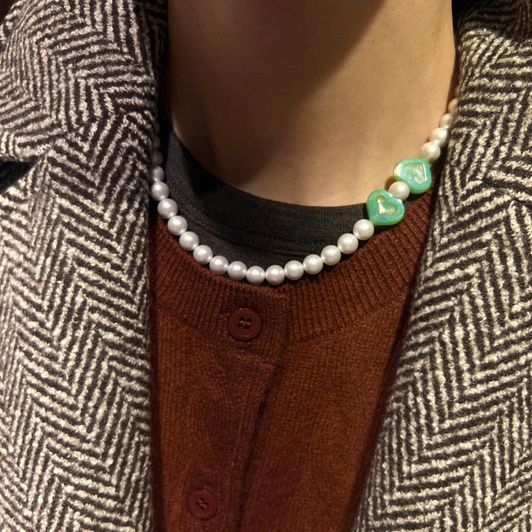 ๊ทธ๋ฆฐ ํํธ ํ ๋น์ฆ ๋ชฉ๊ฑธ์ด(Green Heart Pearl Beads Necklace)๋ ์ฝ 7mm ํต์ง์ฃผ ์ฌ์ด์ ํฌ์ธํธ๊ฐ ๋๋ ์ฒด์ฝ์ฐ ํํธ ๋น์ฆ๋ฅผ ํฌ์ธํธ๋ก ๋ฃ์ด ๋ง๋ค์์ต๋๋ค.