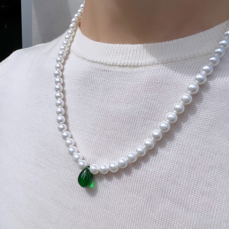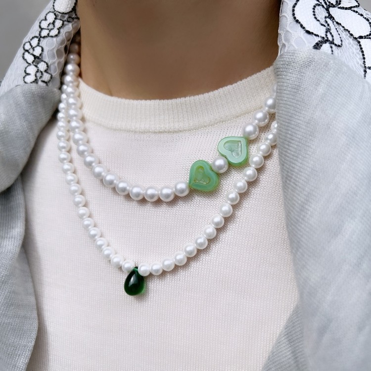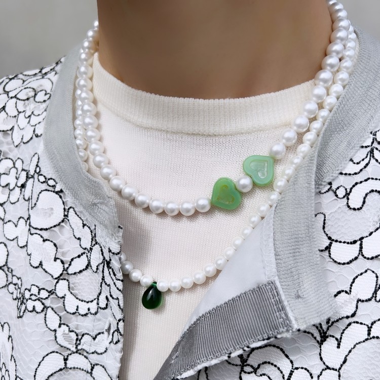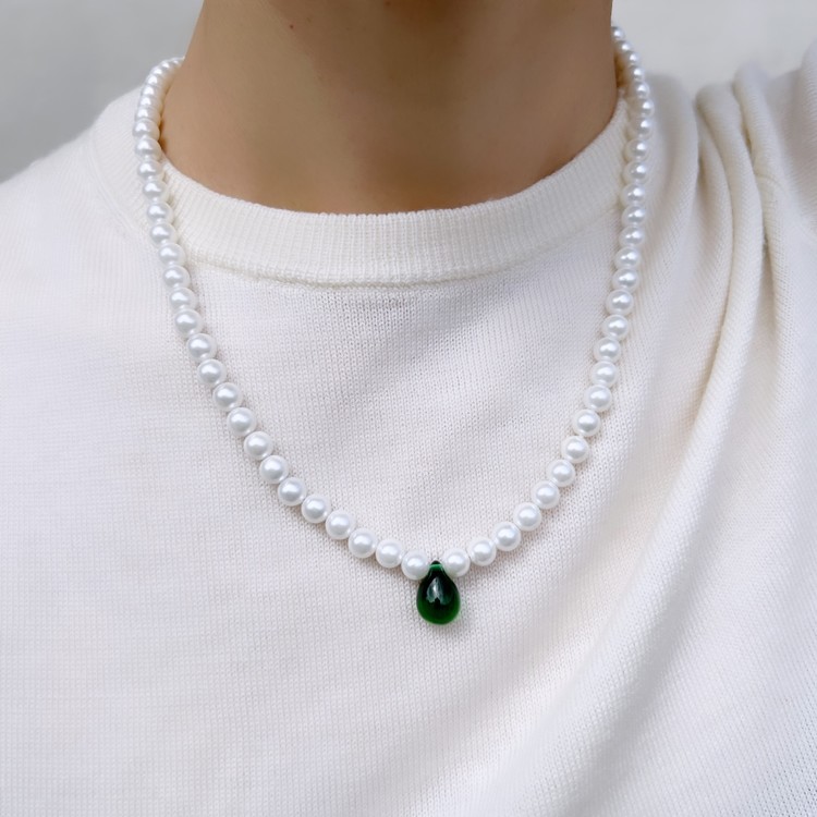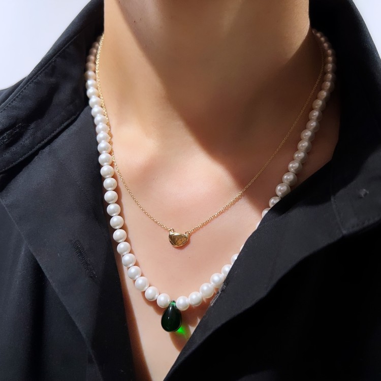 티어드롭 펄 비즈 목걸이(Teardrop Pearl Beads Necklace)는 약 6mm 핵진주 중앙에 포인트가 되는 체코산 물방울 비즈를 포인트로 넣어 만들었습니다. 에메랄드가 연상되는, 유리 소재의 체코산 티어드롭 비즈는 빛이 투영되는 각도에 따라 영롱한 녹색이 아름다우며, 유니크하고 고급스러운 멋을 연출합니다. 목걸이 여밈 부분은 SGJ가 수작업으로 자체 제작한 고리로 완성도를 더합니다. 진주는 핵진주 소재로, 실용적으로 착용할 수 있습니다. 49cm, 53cm 두 가지 기장으로 작업되며, 평균 목걸이 기장인 42cm 보다 긴 형태는 편안하고 쉬크하게 스타일링 하기 좋습니다.