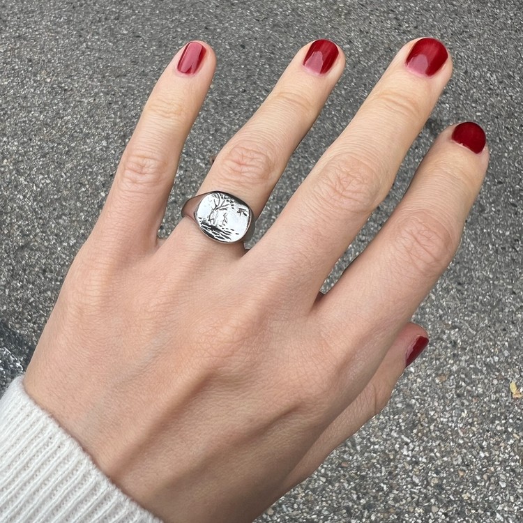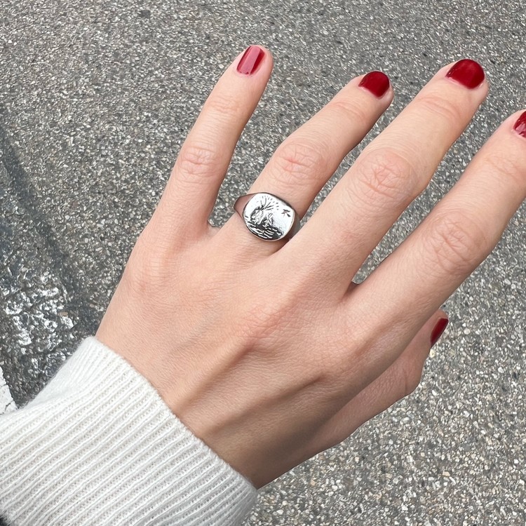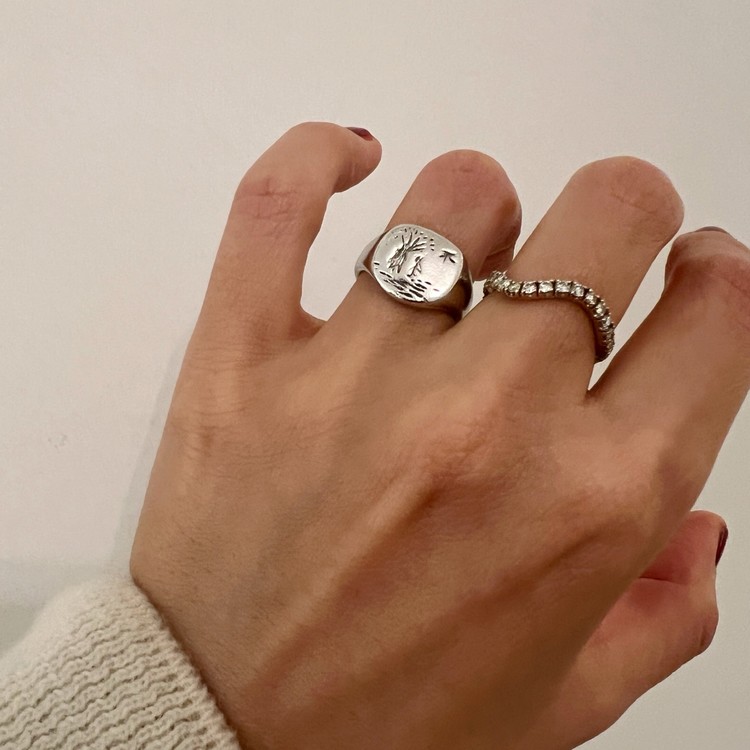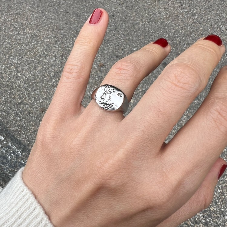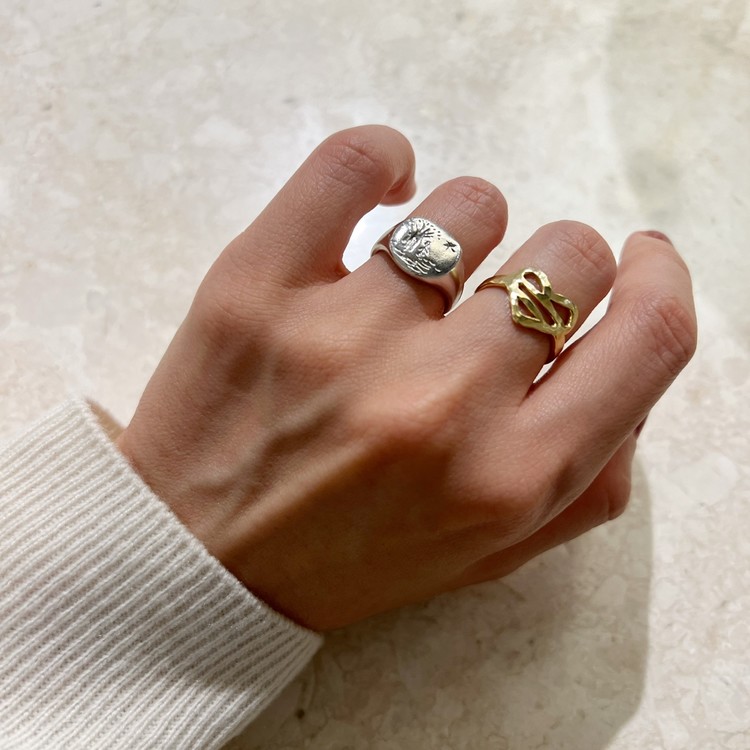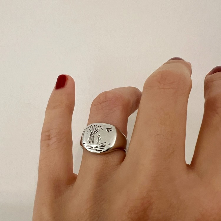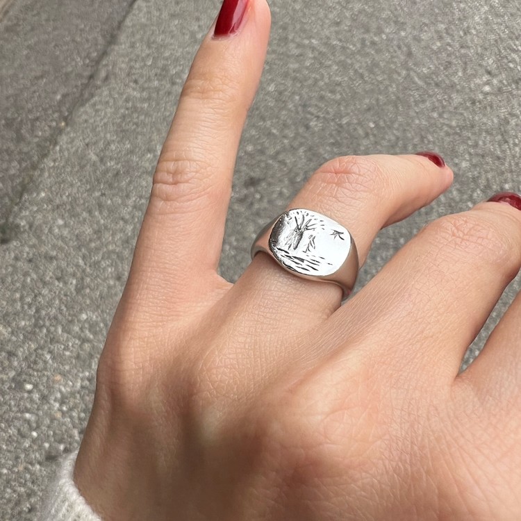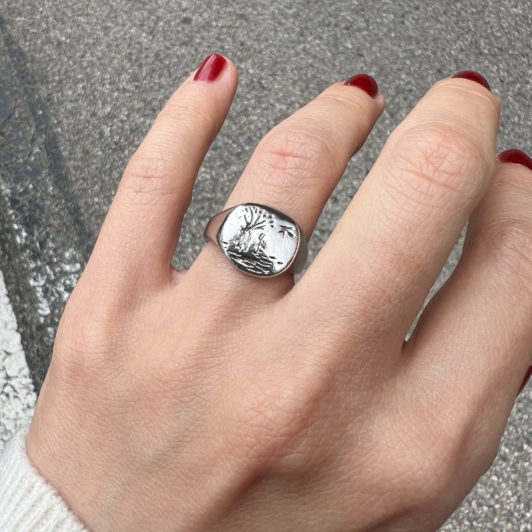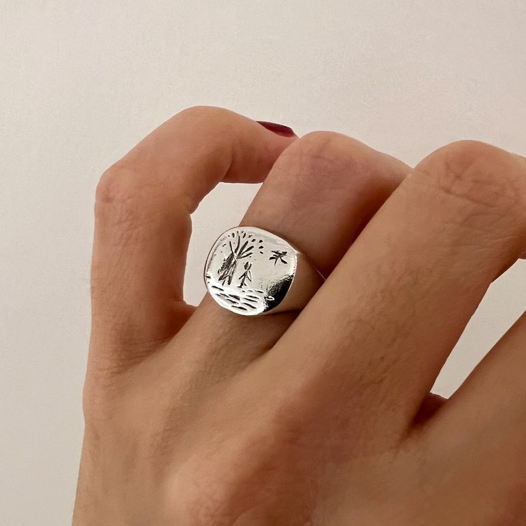 드로잉 시그넷 링(Drawing Signet Ring)은 주얼리 왁스를 사용하여 수작업으로 반지 형태를 깎은 후, 전면에 김호진 작가가 직접 그림을 새겨 넣었습니다. 나무와 사람, 그리고 별을 표현하였으며 드로잉에서 풍기는 서정적 아름다움이 모던하고 심플한 반지의 형태와 어우러져 SGJ만의 멋을 즐기실 수 있는 피스입니다. 김호진 작가의 그림을 좋아하시는 분들은 반지에 새겨진 그림을 감상하며 작품처럼 착용하실 수 있으며, 계절과 유행을 타지 않은 스타일은 데일리 아이템으로도 적합합니다.