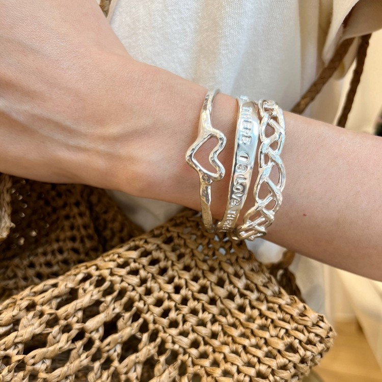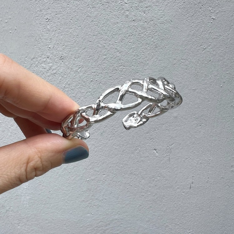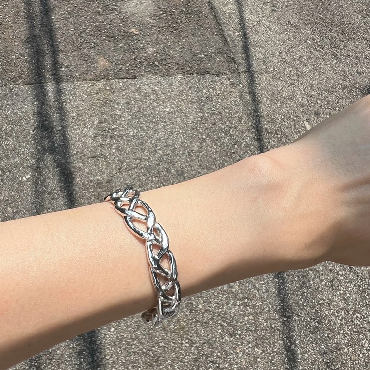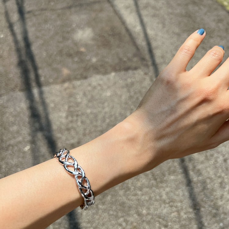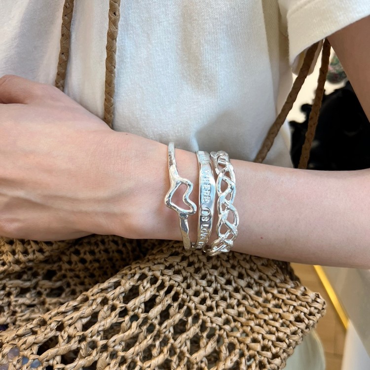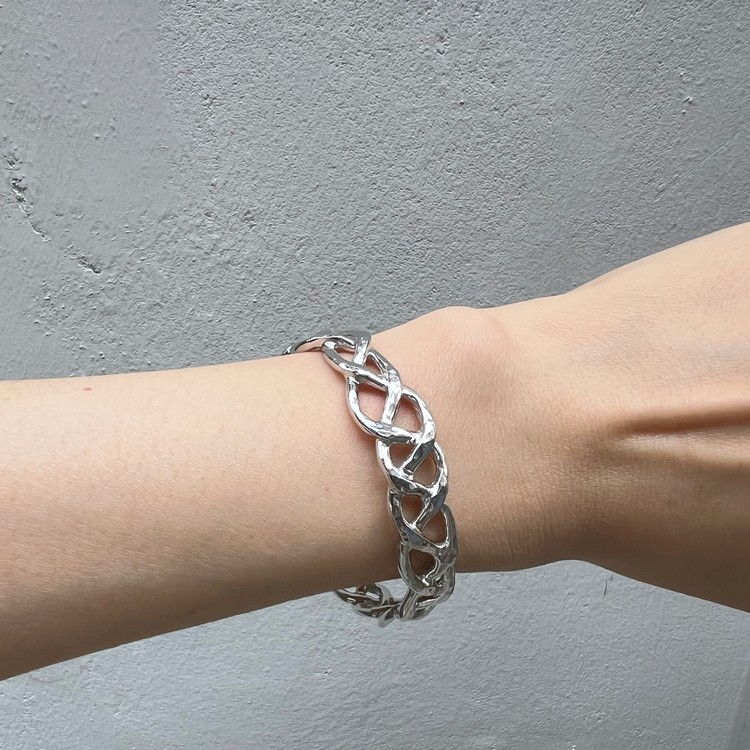 브레이디드 뱅글(Braided Bangle)은 주얼리 작업에 사용하는 선 형태의 왁스를 사용하여, 마치 머리를 땋듯 꼬아 작업한 팔찌입니다. 절제된 볼드함과 동시에 비정형적 곡선의 리듬감이 부드러운 카리스마를 연출합니다. 팔찌의 표면은 SGJ 시그니쳐인 헤머링 텍스쳐를 더해 고급스럽습니다.