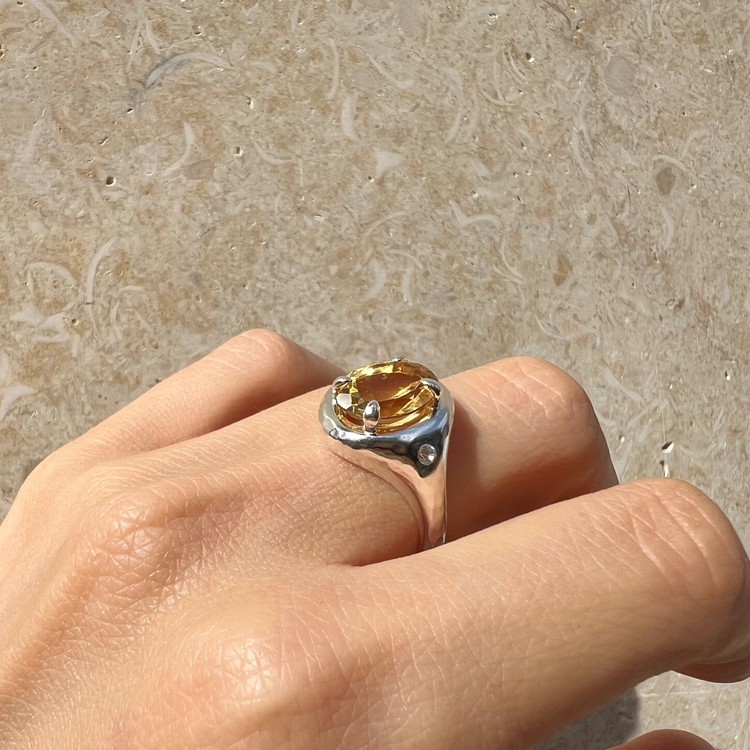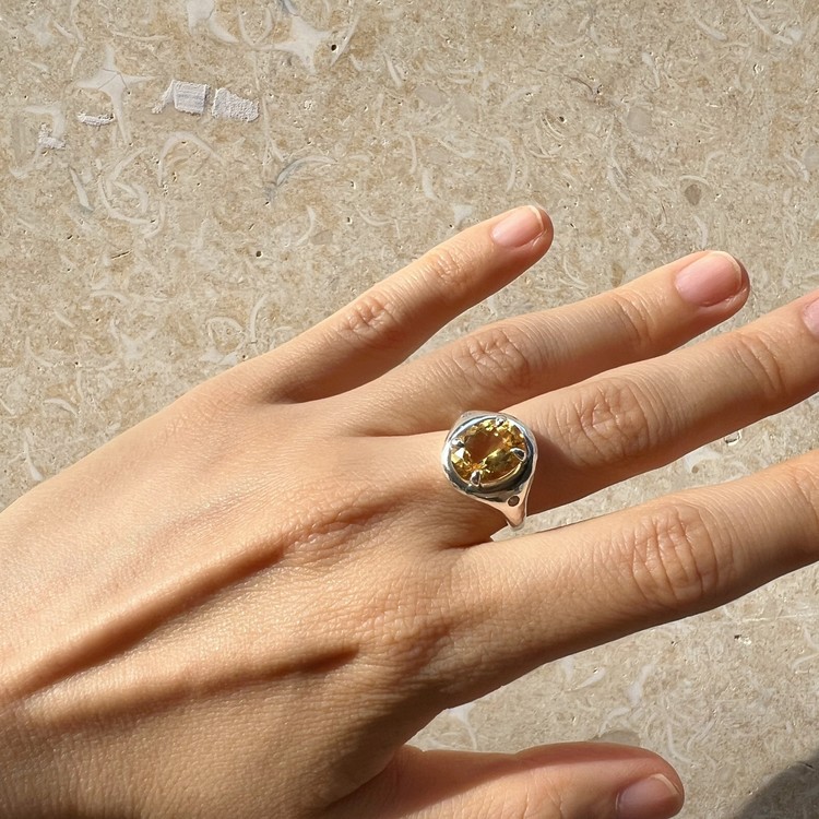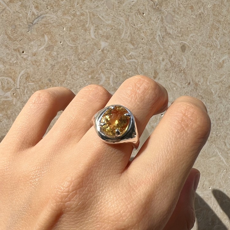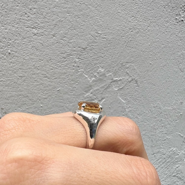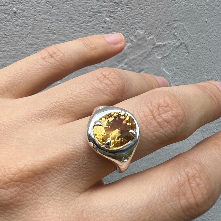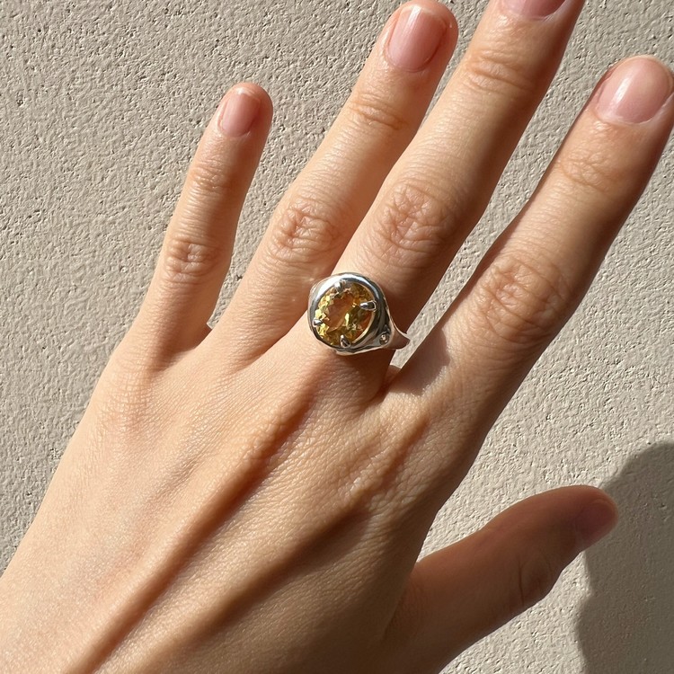 에버글로우 링(Everglow Ring) 시트린 버젼은 금색과 주황색을 섞어 놓은 듯한 색감의 시트린을 메인 스톤으로 셋팅하고, 양쪽 측면에는 은은한 포인트 화이트 사파이어를 우물 조각 방식으로 셋팅한 반지입니다. 4개의 난발로 스톤을 물려 빛 투과율을 높였기 때문에 스톤의 반짝임을 즐기실 수 있는 피스입니다. 은의 표면은 헤머링 텍스쳐를 은은하게 넣어 수작업의 고급스러움을 더했습니다. 반지는 전면부 크기가 가로 약 10mm, 세로 약 13mm로, 스톤 반지이지만 블링블링 하지 않고 멋스럽게 착용하기 좋은 사이즈의 반지입니다.