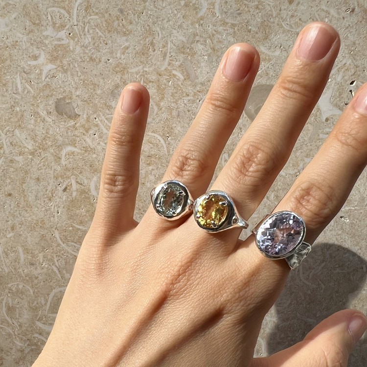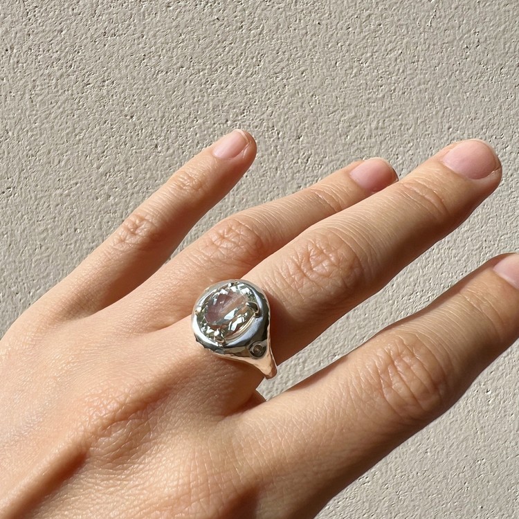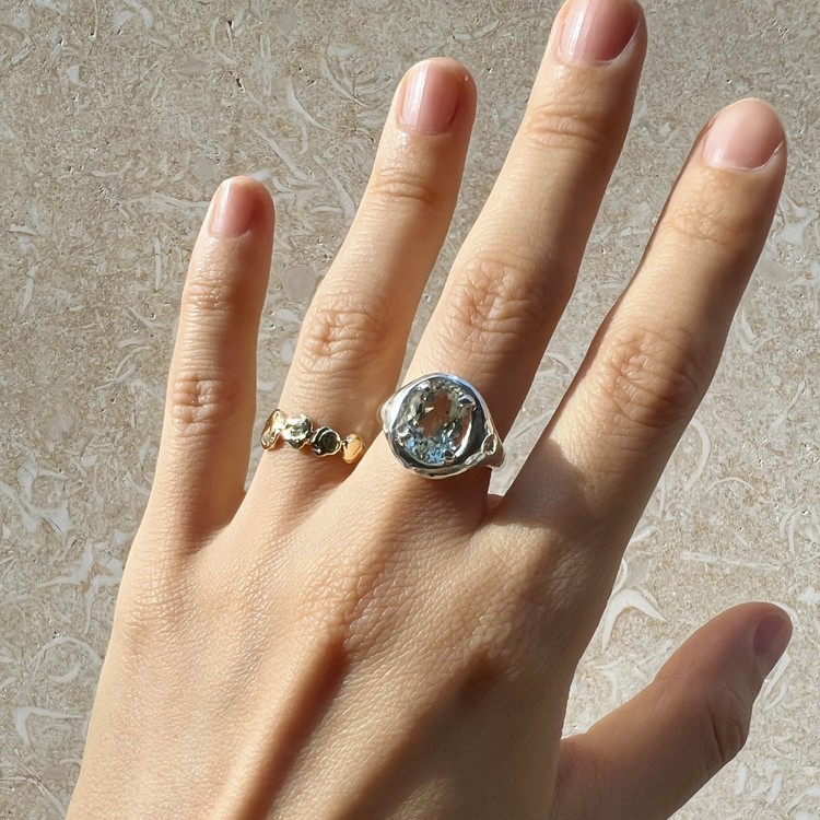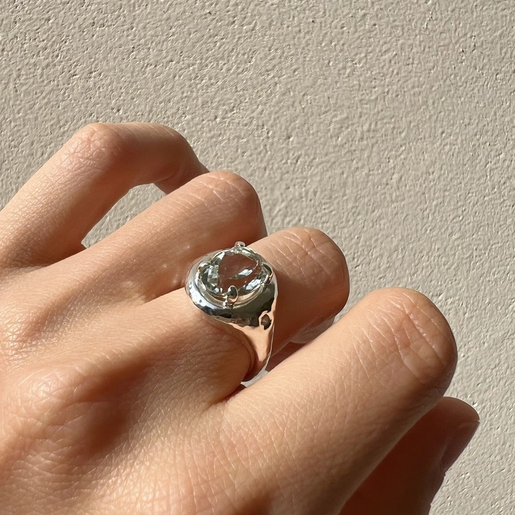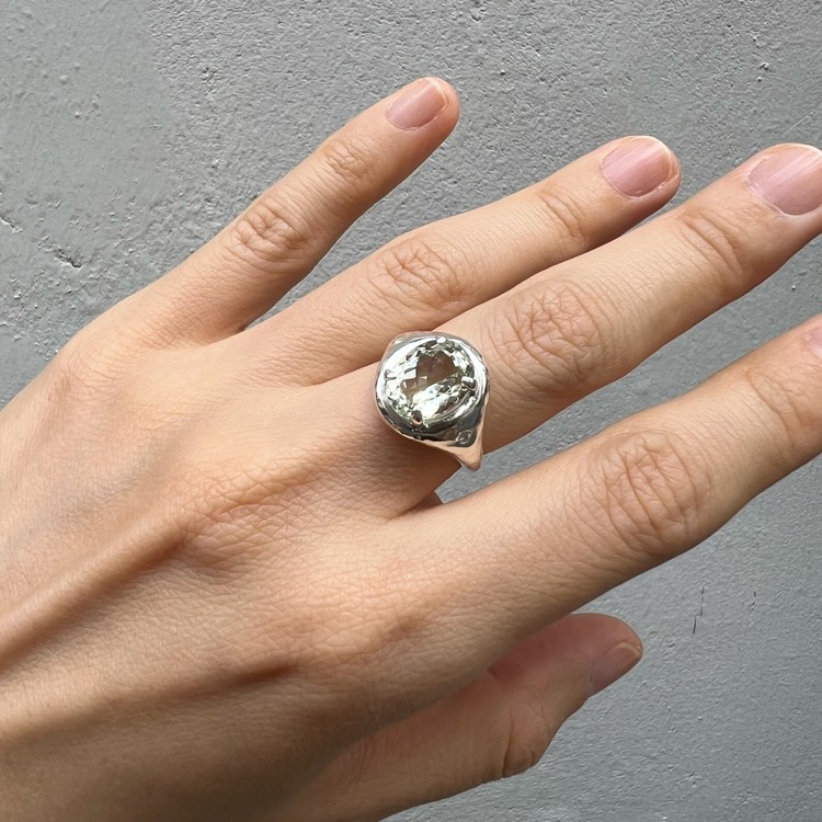 에버글로우 링(Everglow Ring) 그린 쿼츠 버젼은 은은한 녹색이 감도는 그린 퀴츠를 메인 스톤으로 셋팅하고, 양쪽 측면에는 화이트 사파이어를 우물 조각 방식으로 셋팅한 반지입니다. 4개의 난발로 스톤을 물려 빛 투과율을 높였기 때문에 스톤의 영롱함을 즐기실 수 있는 피스입니다. 은의 표면은 헤머링 텍스쳐를 은은하게 넣어 수작업의 고급스러움을 더했습니다. 반지는 전면부 크기가 가로 약 10mm, 세로 약 13mm의 사이즈로, 스톤 반지이지만 블링블링 하지 않고 담백하게 멋스럽게 착용하기 좋은 피스입니다.