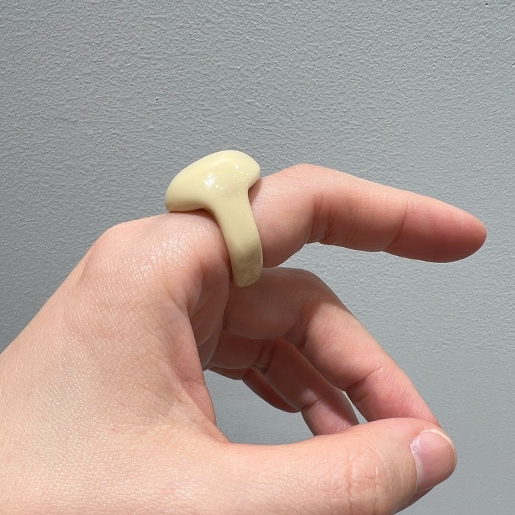 볼 링(Ball Ring) 크림 버젼은 김호진 작가가 주얼리 왁스를 깎아 직접 손가락에 착용해 가며 작업하였습니다. 수작업으로 만들어진 반구형에는 미니멀하고 세련된 손맛이 담겨 있습니다. 크림 컬러의 플라스틱은 마치 상아 소재를 연상시키며 은은하고 고급스러운 멋을 더합니다. 금, 은 소재 반지들과 함께 착용해도 멋진 주얼리 스타일링 연출이 가능합니다.