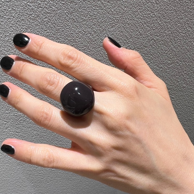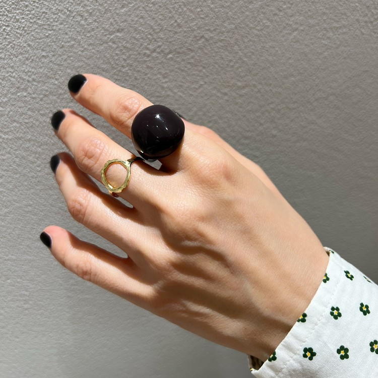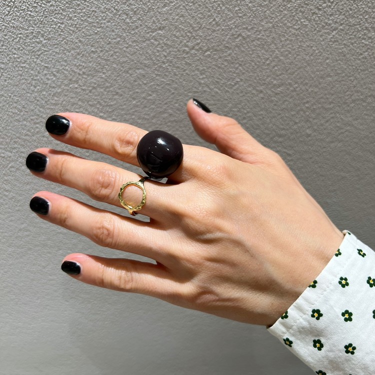 볼 링(Ball Ring) 쵸코 버젼은 김호진 작가가 주얼리 왁스를 깎아 직접 손가락에 착용해 가며 작업하였습니다. 수작업으로 만들어진 반구형에는 미니멀하고 세련된 손맛이 담겨 있습니다. 보라빛이 살짝 감도는 짙은 브라운 컬러의 플라스틱 소재는 마치 쵸콜렛을 연상시키며 심플하면서도 독특한 멋을 더합니다. 금, 은 소재 반지들과 함께 착용해도 멋진 주얼리 스타일링 연출이 가능합니다.