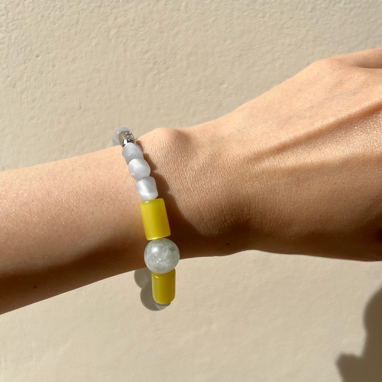 블루 레몬네이드 비즈 팔찌(Blue Lemonade Beads Bracelet)는 원형의 아쿠아마린 원석 비즈를 포인트로 하여 독일산 빈티지 비즈로 만들었습니다. 원통형, 원형, 비정형등 서로 다른 형태이지만 파스텔톤 블루와 노랑의 조합은 고급스럽고 세련된 스타일을 연출합니다. 아쿠아마린 원석은 표면이 반무광 처리되어 더욱 멋스럽습니다. 팔찌 중앙의 백금 도금된 황동 소재 참은 SGJ 수작업으로 빚어 만들었기 때문에 완성도가 높습니다. SGJ에서만 보실 수 있는 특유의 절제된 고급스러움이 듬뿍 담긴 팔찌입니다.