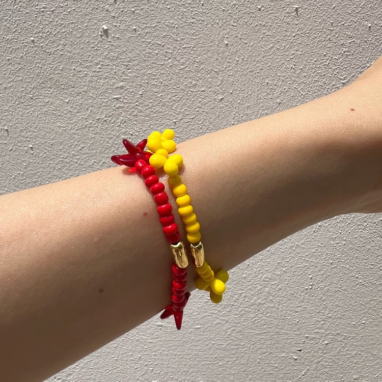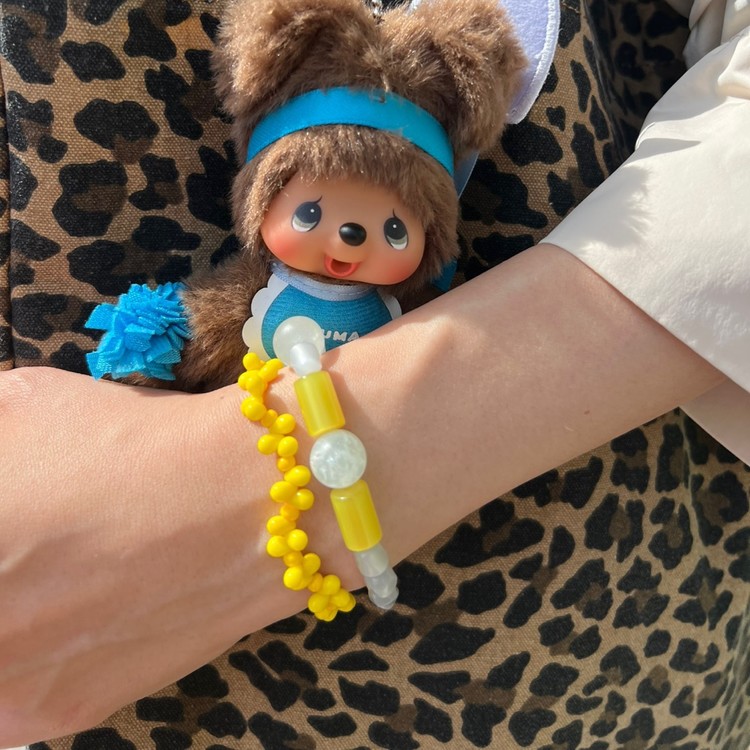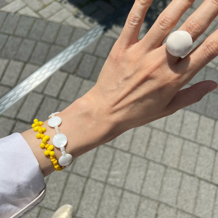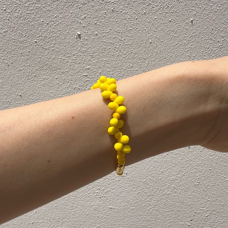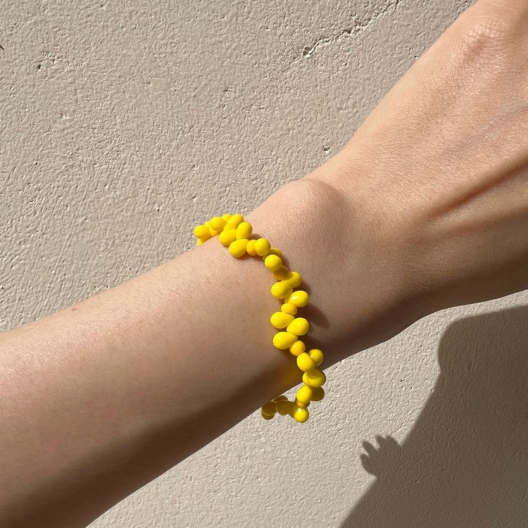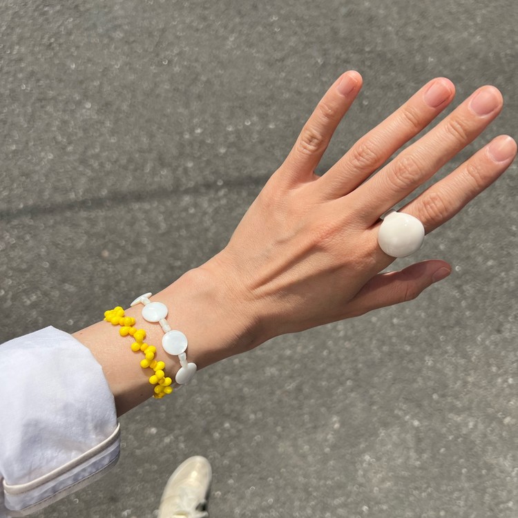바나나 비즈 팔찌(Banana Beads Bracelet)는 SGJ의 세컨드 브랜드 JEAN의 제품으로, 작은 물방울 모양의 체코산 비즈들이 마치 레이스처럼 엮여 있는 독특한 느낌의 피스입니다. 경쾌하고 사랑스러운 포인트가 될 수 있는 팔찌입니다. 팔찌 중앙의 도금된 황동 소재 참은 수작업으로 빚어 만들어 완성도를 높였습니다.