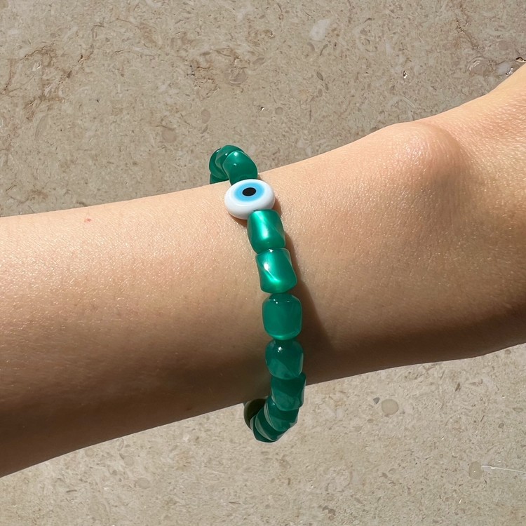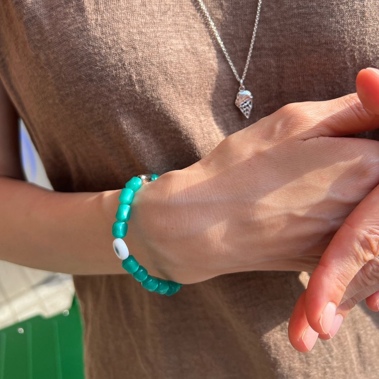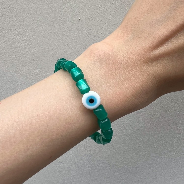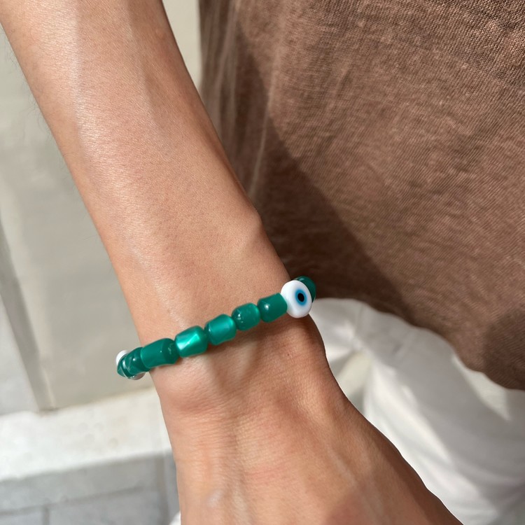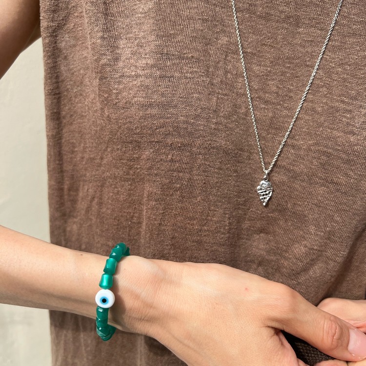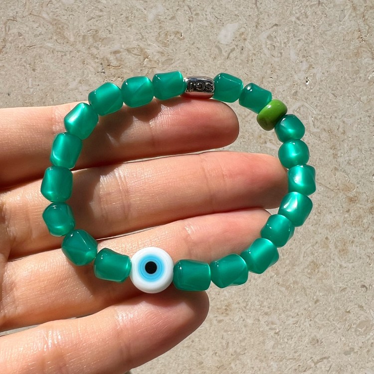 이블 아이 비즈 팔찌(Evil Eye Beads Bracelet)는 짙은 초록색을 띄면서 몽환적인 글로우가 독특한 유럽산 빈티지 비즈를 메인으로, 액운을 막아준다는 이블 아이(Evil Eye) 비즈를 포인트로 넣어 엮었습니다. 쿨톤의 색상은 특히 여름 시즌 청량감을 주며, 빈티지 비즈 특유의 독특함으로 심플한 디자인이지만 세련된 멋을 즐기실 수 있는 팔찌입니다. 팔찌 중앙의 도금된 황동 소재 참은 SGJ 수작업으로 빚어 만들고 백금 도금 하여 완성도가 높습니다.