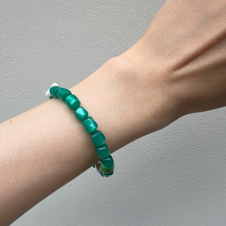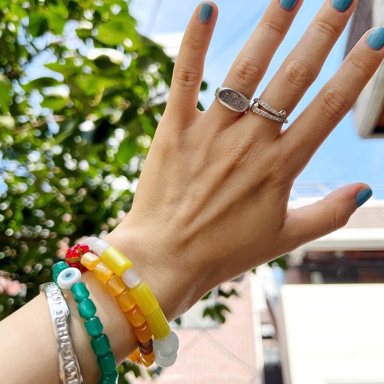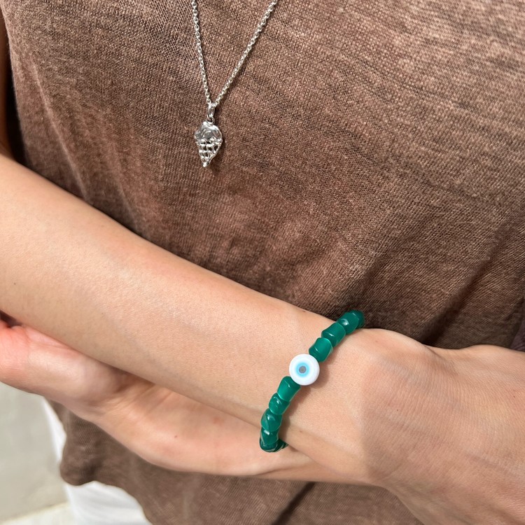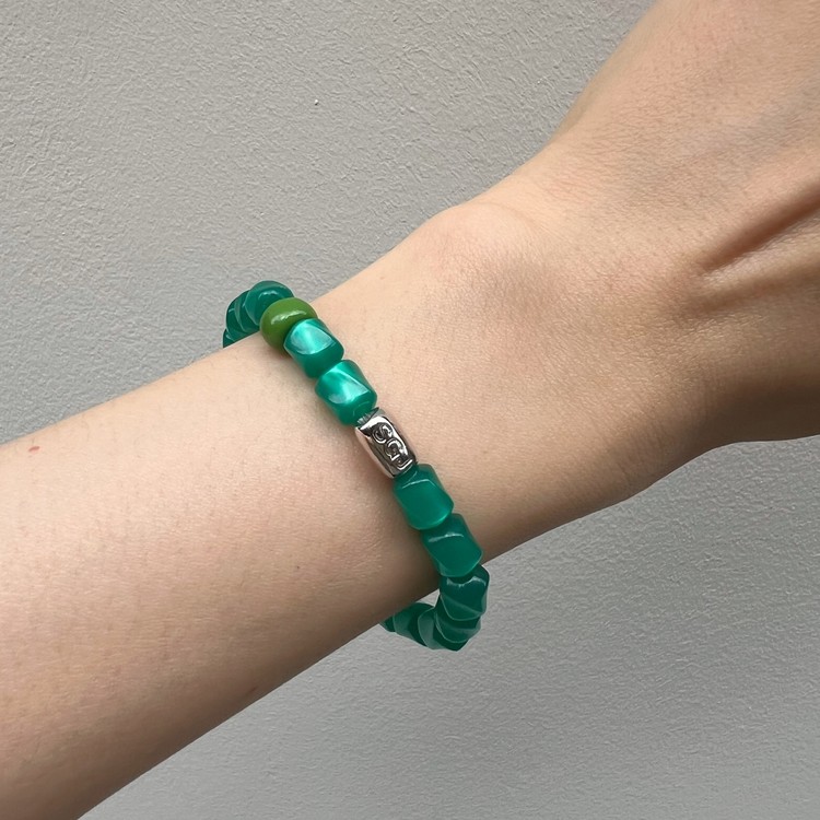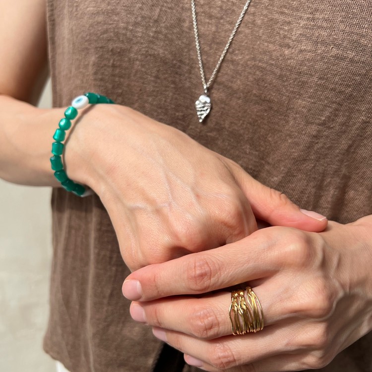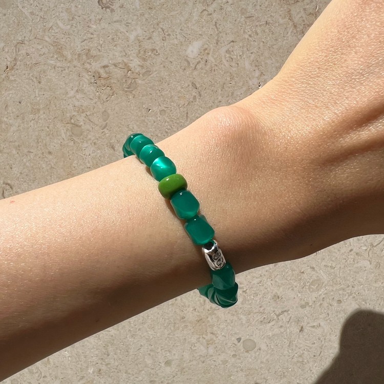 이블 아이 비즈 팔찌(Evil Eye Beads Bracelet)는 짙은 초록색을 띄면서 몽환적인 글로우가 독특한 유럽산 빈티지 비즈를 메인으로, 액운을 막아준다는 이블 아이(Evil Eye) 비즈를 포인트로 넣어 엮었습니다. 쿨톤의 색상은 특히 여름 시즌 청량감을 주며, 빈티지 비즈 특유의 독특함으로 심플한 디자인이지만 세련된 멋을 즐기실 수 있는 팔찌입니다. 팔찌 중앙의 도금된 황동 소재 참은 SGJ 수작업으로 빚어 만들고 백금 도금 하여 완성도가 높습니다.