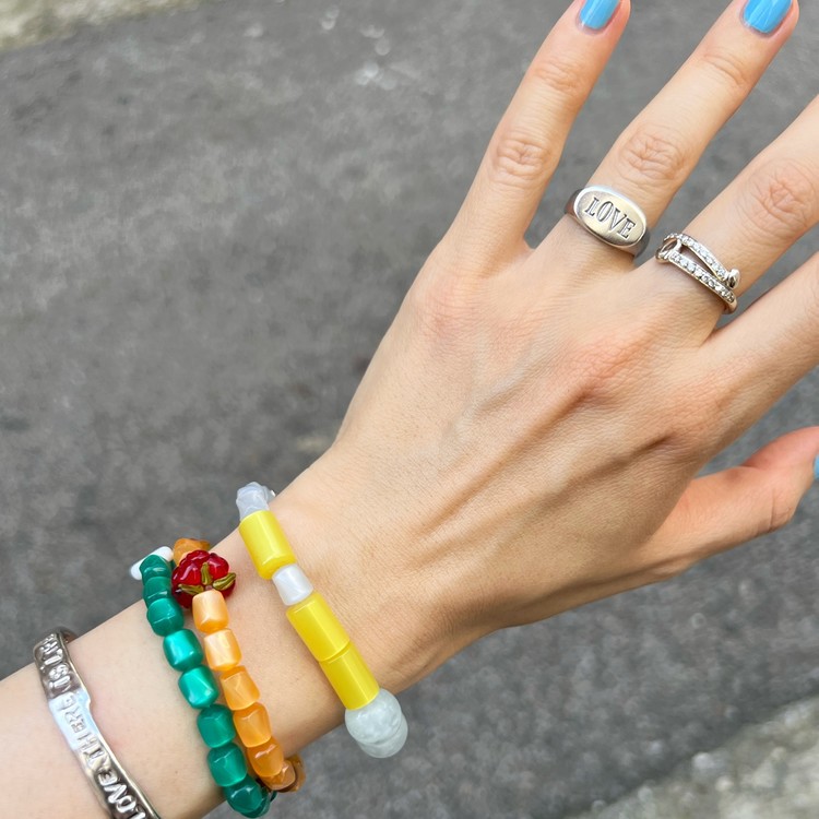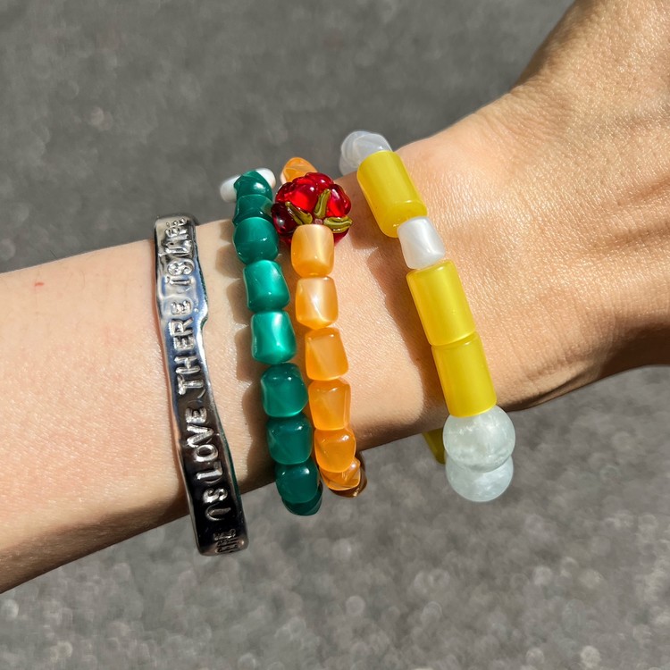 - 팔찌는 우레탄 소재의 투명 고무줄로 작업 되며, 마무리 공정상 필요한 매듭 부분은 눈에 띌 수 있습니다.