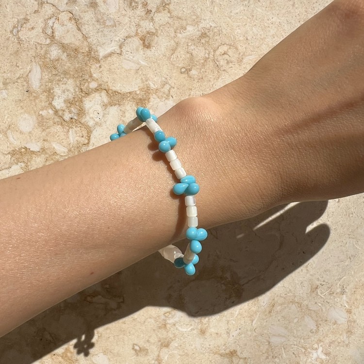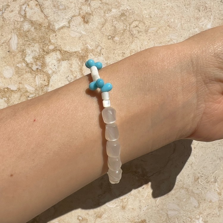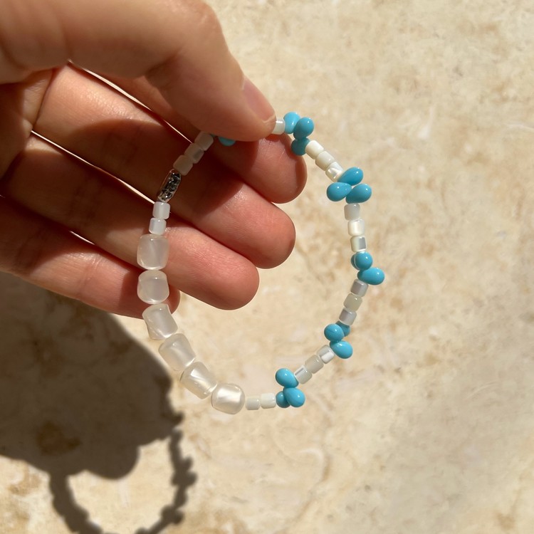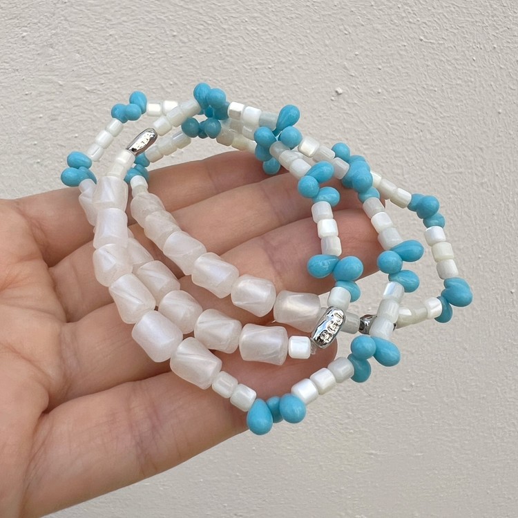 - 팔찌는 우레탄 소재의 투명 고무줄로 작업 되며, 마무리 공정상 필요한 매듭 부분은 눈에 띌 수 있습니다.