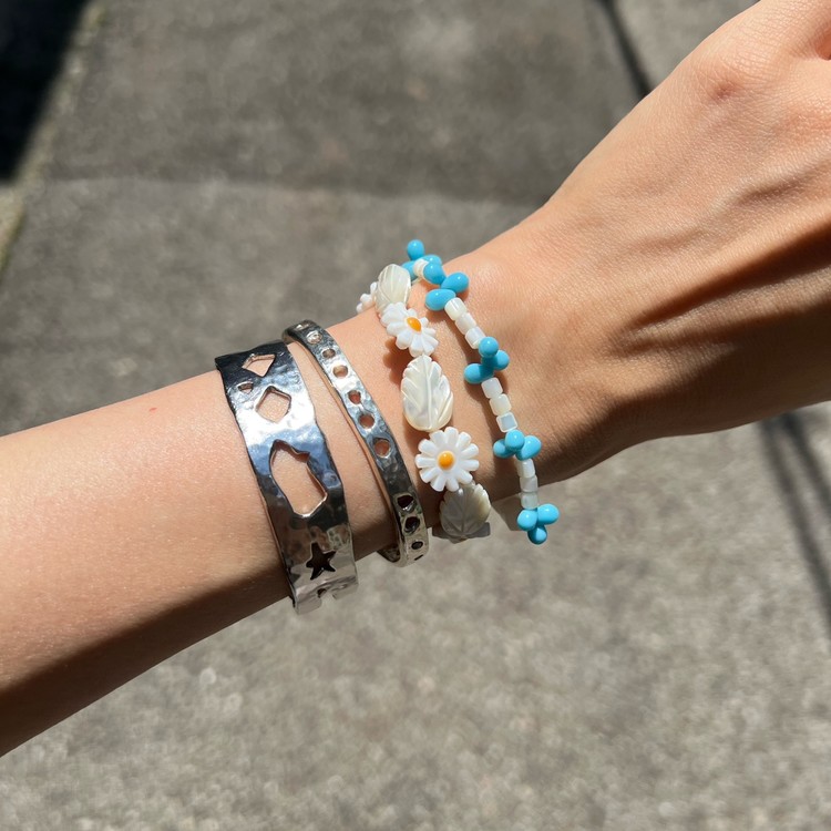 클라우드베리 비즈 팔찌(Cloudberry Beads Bracelet)는 자개로 만든 화이트톤 비즈와 유럽산 엔틱 비즈들 사이에 베이비 블루 컬러의 체코산 유리 비즈가 포인트로 들어간 사랑스러운 피스입니다. 단아하면서도 세련된 느낌으로 캐주얼하게 활용하시기 예쁜 아이템입니다. 팔찌 중앙의 도금된 황동 소재 참은 SGJ 수작업으로 빚어 만들고 백금 도금 하여 완성도를 높였습니다.