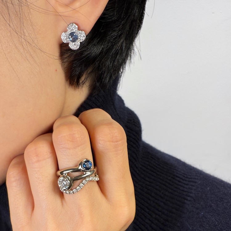 실버 소재로, 변색을 더디게 하기 위해 백금 도금으로 마무리 하였습니다. 블룸 닷 귀걸이는 다이아몬드등 SGJ 하이엔드 파인 주얼리를 작업하는 과정과 똑같은 공정으로 스톤 한 개 한 개씩 셋팅하고 작업하여 퀄리티가 높습니다.
