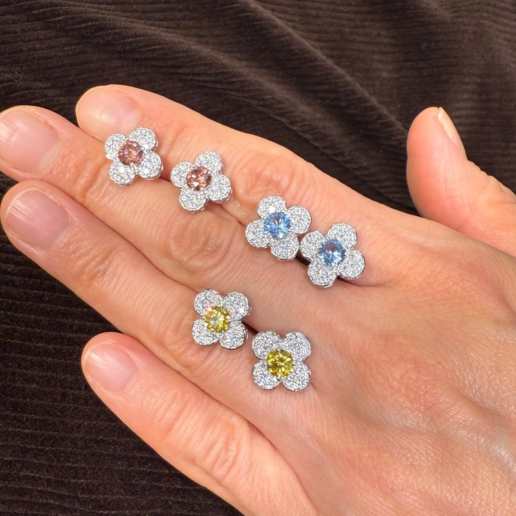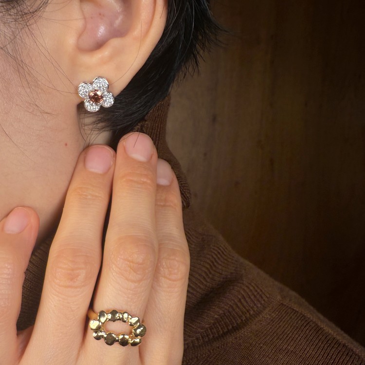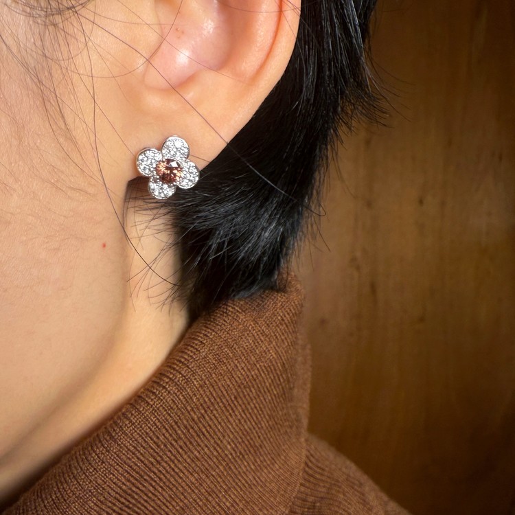 귀걸이 전체의 크기는 약 1.4cm로 데일리용 스터드 귀걸이로 적합한 사이즈이며, 꽃잎은 모이사나이트를 촘촘하게 셋팅, 귀걸이 전체의 반짝임을 배가시켜 고급스러움을 더했습니다.