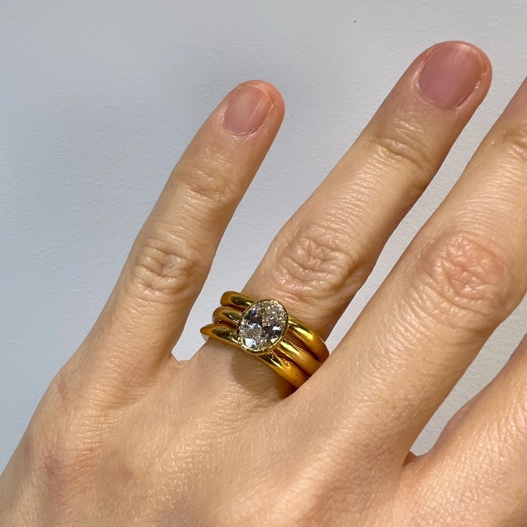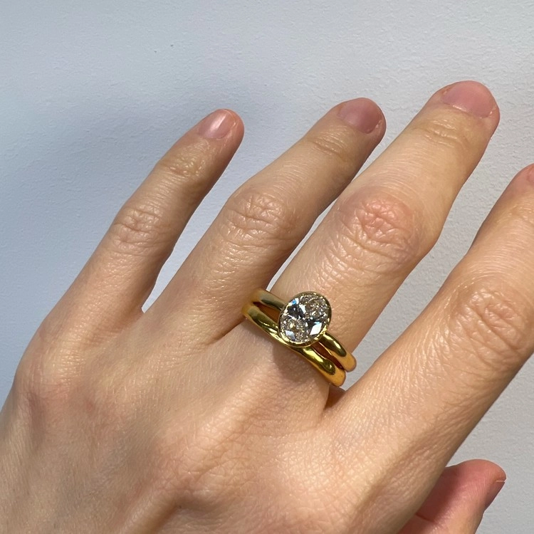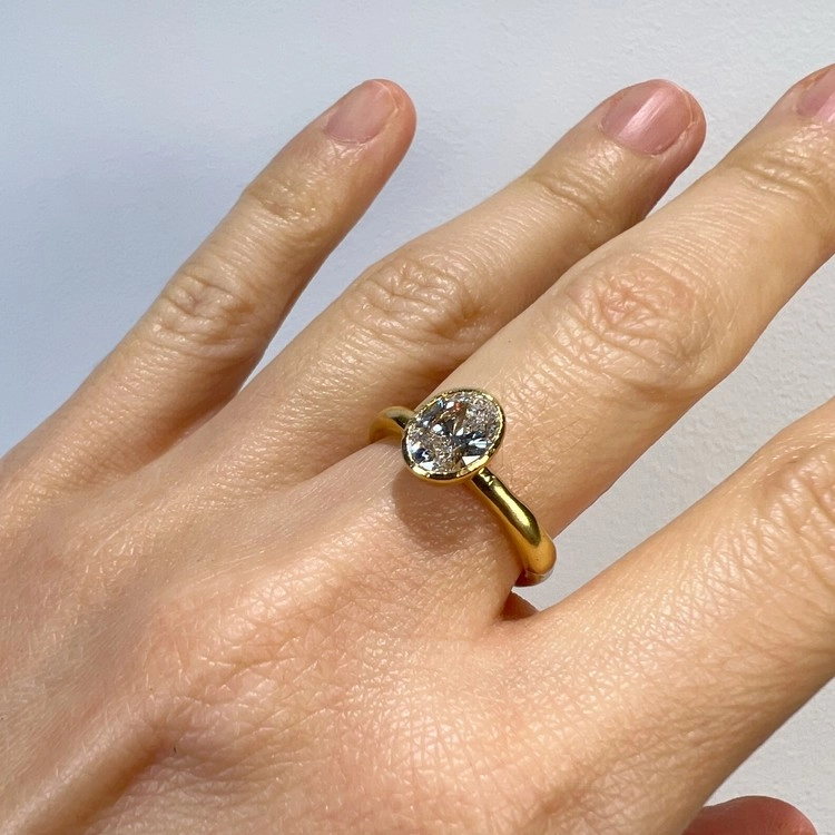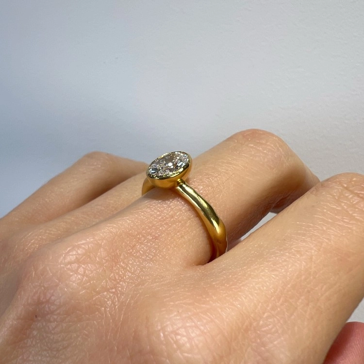 1캐럿, 오발형태 랩 그로운 다이아몬드 반지(Oval Lab Grown Diamond Ring 1ct)는 클래식하면서도 유니크한 SGJ의 멋을 느낄 수 있는 피스입니다. 반지의 밴드 부분은 비정형적 아름다움이 느껴지도록 수작업으로 만들었으며, 메인 스톤을 안정적으로 감싸는 베즐 셋팅은 정교한 캐드 (CAD) 설계를 통해 완성도와 내구성을 극대화 했습니다. 반지의 소재는 18K보다 금 함량이 높은 22K 골드로 특유의 묵직하고 짙은 금빛으로 SGJ에서만 만나실 수 있는 고풍스러운 미감입니다.