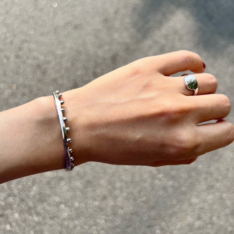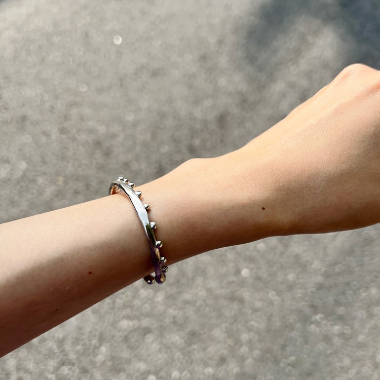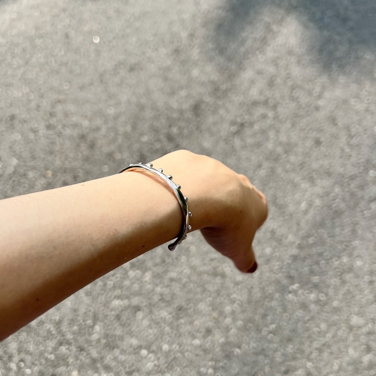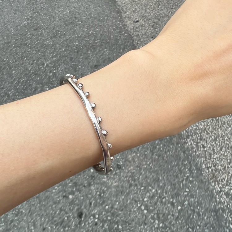 선구슬 뱅글(Line & Dots Bangle)은 SGJ의 스테디셀러 뱅글로, 약 3mm의 선위에 손맛이 느껴지는 동그라미들이 불규칙적으로 배열되어 있습니다. 얇은 뱅글의 두께감은 가볍고 편안한 착용감이며, 부담없이 매일 착용하기 좋은 데일리 아이템으로도 적합합니다. 뱅글 내경은 약 15.5cm으로 사이즈 M을 기본형으로 작업됩니다. M 사이즈는 손목 둘레 13.5~14.5cm인 경우 편하게 착용하실 수 있으며, 그 외의 사이즈는 맞춤 제작으로 작업됩니다.